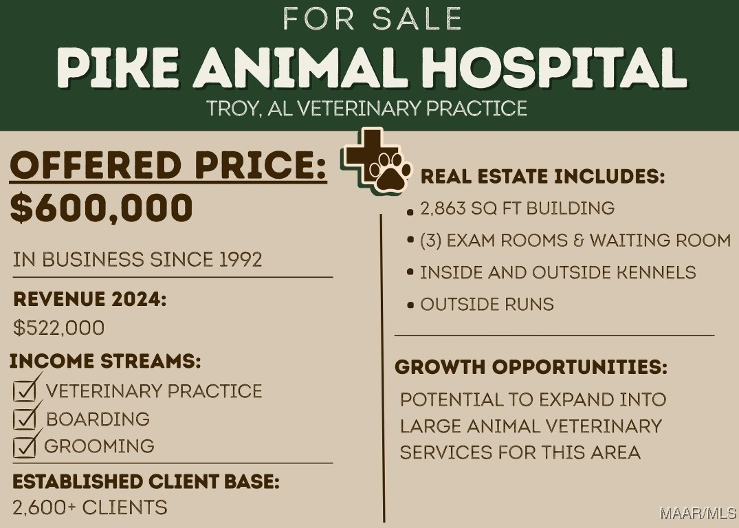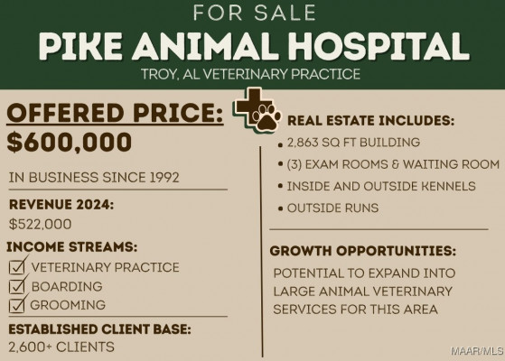 Veterinary practice in Troy, Alabama, in operation for 33 years, includes boarding and grooming services, along with the associated real estate. Wonderful, experienced staff in place and is now offered for sale by the family of Dr. Lawrence Johnston. Pike Animal Hospital boasts a long-standing, highly regarded presence in the Troy community, built on compassionate care for small and large animals. Offered for sale by Dr. Johnston’s family, this practice has earned trust through decades of reliable service, making it a beloved local institution. The acquisition includes the veterinary practice, the well-maintained building, and all essential equipment and furnishings for seamless daily operations. Benefit from a clientele of over 2,600 long-time clients eager to maintain their relationship with the practice. This solid foundation provides opportunities for steady income and organic growth. The hospital features 3 exam rooms, a dedicated surgery suite plus complete office furnishings. Enhance your revenue streams with overnight and long-term boarding in clean, climate-controlled facilities. Grooming services add further value, catering to the full spectrum of pet care needs. Step into an operational business designed for smooth handover. Ideal for an individual veterinarian or expanding group. Situated in a prime market with a growing demand for veterinary services, this operation is poised for expansion. A personable, professional veterinarian can leverage the existing infrastructure to introduce new specialties, extend hours and potentially add large animal services in this welcoming Southern community.