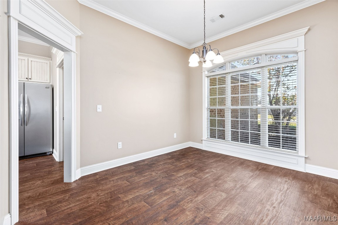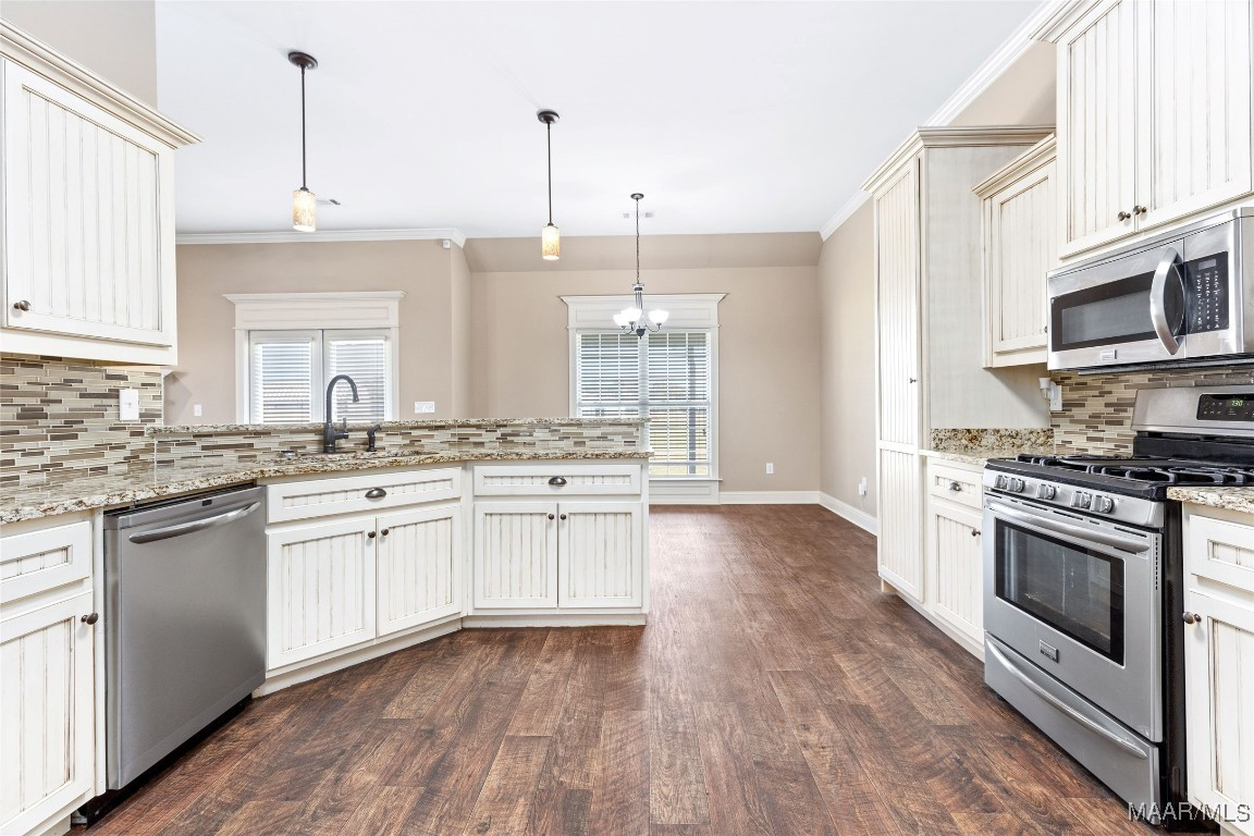 The kitchen overlooks the living space and offers ample cabinet and countertop space with gorgeous granite countertops, a stylish backsplash, and stainless steel appliances. A breakfast nook is tucked away on one side of the kitchen, while a formal dining area sits on the other. The layout flows perfectly into the laundry room, which provides convenient access to the two-car garage.