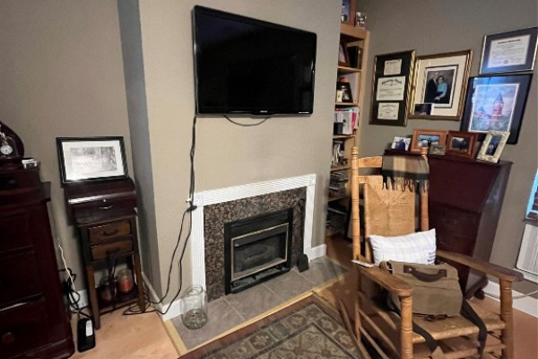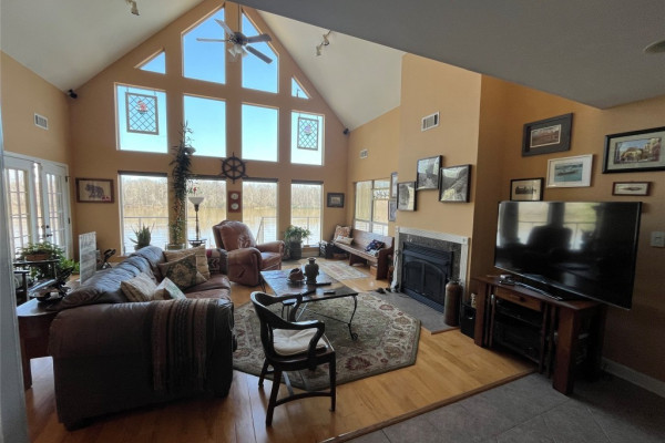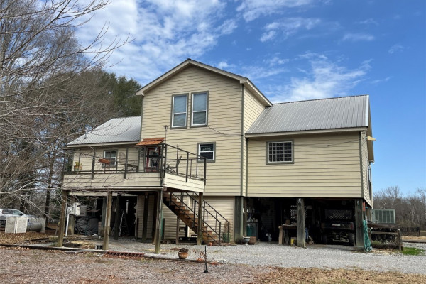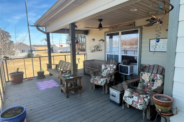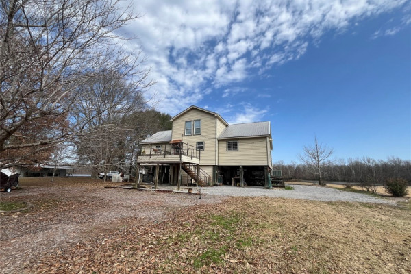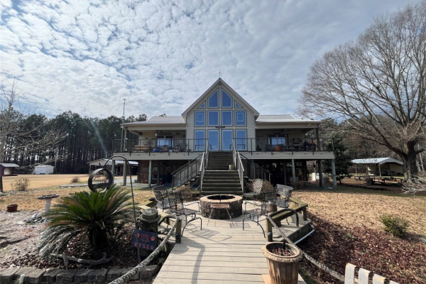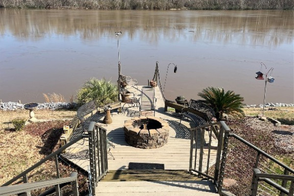 Enjoy the outdoors with two porches on the front side, perfect for relaxing or entertaining. A cozy fireplace anchors the main living area, blending warmth with rustic charm. The gently sloping lot leads down to a serene riverbank where you’ll find a metal grate pier ideal for fishing, lounging, or tying up your boat.