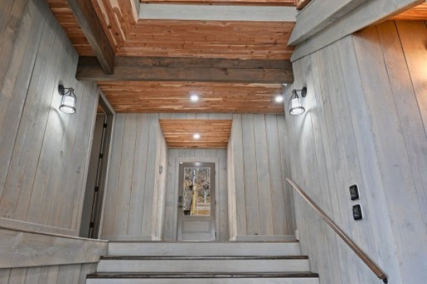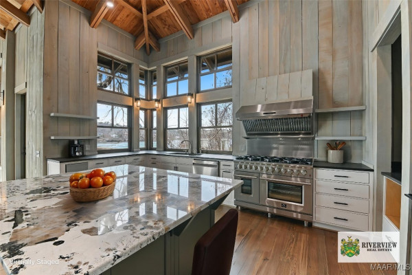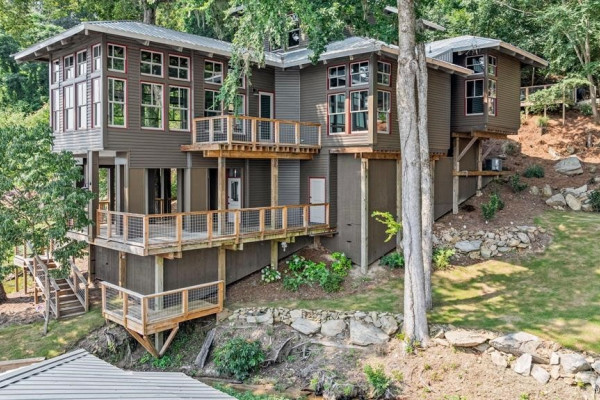 The open-concept kitchen and living area boast black leathered granite countertops, a Patagonia granite island, custom soft-close cabinetry, and a commercial-grade dual oven. Two inviting decks off the kitchen and living room provide the perfect setting for coffee or cocktails. The primary suite is a retreat with 17-ft ceilings and stunning lake views. Upstairs features a bedroom, mezzanine loft, and two cozy sleeping nooks (6’ x 12.5’).