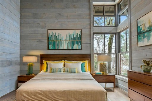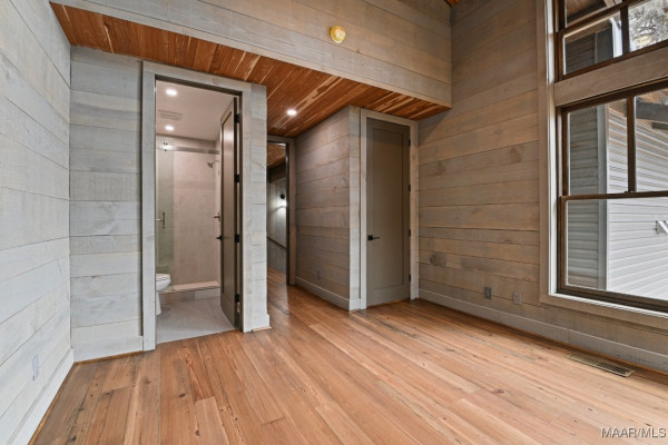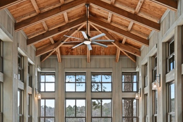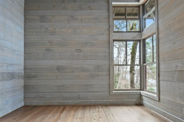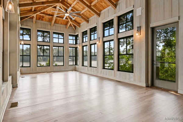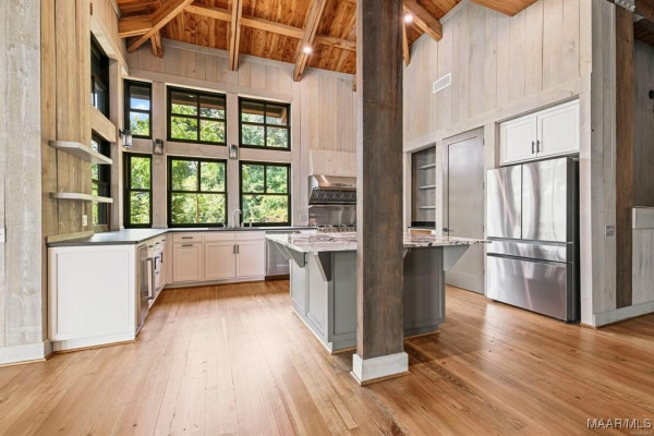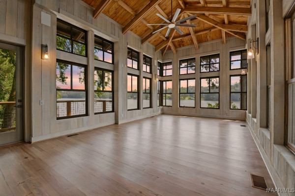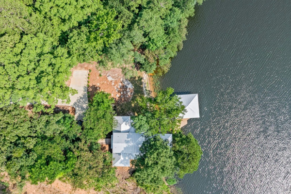 Nestled on the tranquil shores of Jordan Lake, this breathtaking 3,314 sq. ft. architectural masterpiece was custom-designed by an architect and completed in January 2025. Sitting just feet from the water on over an acre of private land, it offers unmatched lake views and an unparalleled living experience. Vaulted cedar ceilings with exposed beams complement antique reclaimed heart pine floors, while towering 16-foot ceilings create a grand, open feel, and panoramic windows fill the home with natural light.