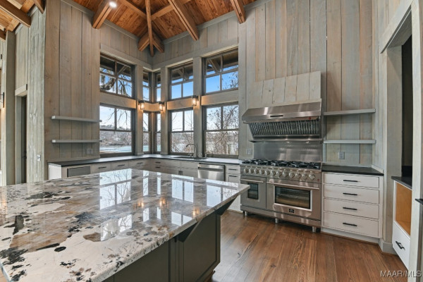 The open-concept kitchen and living area boast black leathered granite countertops, a Patagonia granite island, custom soft-close cabinetry, and a commercial-grade dual oven. Two inviting decks off the kitchen and living room provide the perfect setting for coffee or cocktails. The primary suite is a retreat with 17-ft ceilings and stunning lake views. Upstairs features a bedroom, mezzanine loft, and two cozy sleeping nooks (6’ x 12.5’).