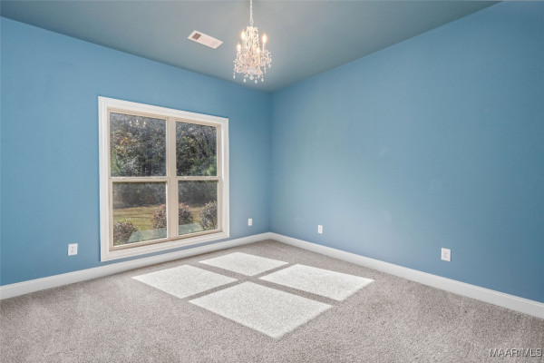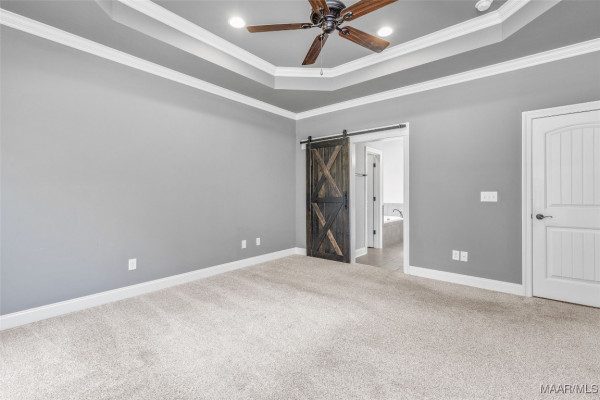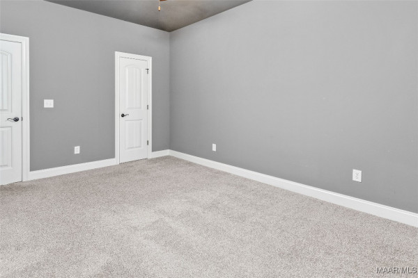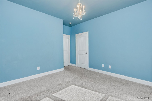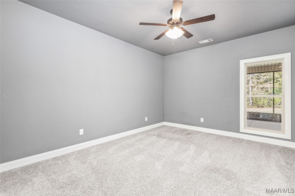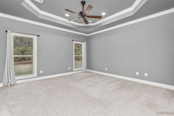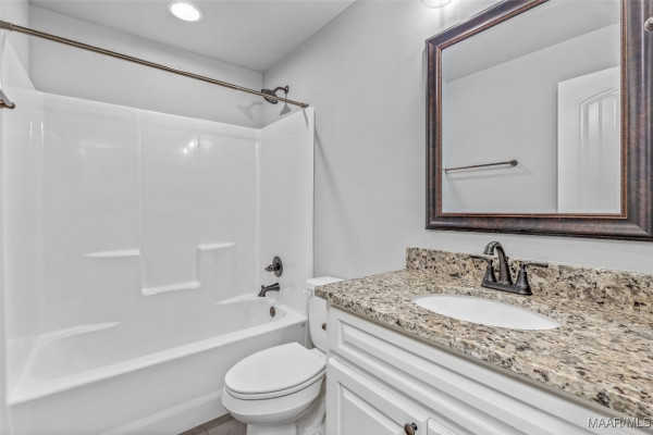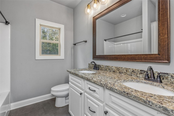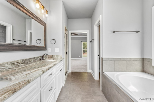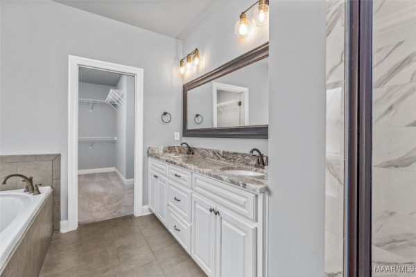 The home’s split floor plan places two of the three guest bedrooms on one side, separated by a hallway with a full bath that includes a double vanity with granite countertops, a tub/shower combo, and a linen closet. The primary suite is privately located on the opposite side of the home, offering tray ceilings, plenty of space for a king set, and an ensuite bath featuring a luxurious tile shower, a large garden tub, and a HUGE walk-in closet.