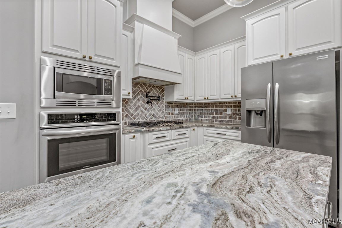 Step through the impressive double 8-foot wooden doors into the welcoming foyer, which opens to a spacious living area featuring high ceilings and a cozy fireplace as the focal point. Off the living space is a beautiful dining area and a custom kitchen designed for both function and style — showcasing leathered granite countertops, custom cabinetry, a gas cooktop with pot filler, wall-mounted microwave and oven, stainless steel appliances, and a large work island. A breakfast nook sits conveniently to one side, with easy access to the garage and laundry room, which features additional custom cabinets, a utility sink, and granite countertops.