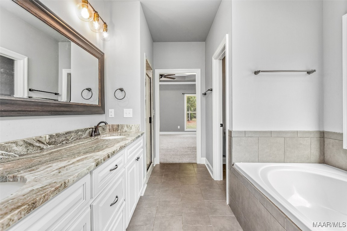 The home’s split floor plan places two of the three guest bedrooms on one side, separated by a hallway with a full bath that includes a double vanity with granite countertops, a tub/shower combo, and a linen closet. The primary suite is privately located on the opposite side of the home, offering tray ceilings, plenty of space for a king set, and an ensuite bath featuring a luxurious tile shower, a large garden tub, and a HUGE walk-in closet.