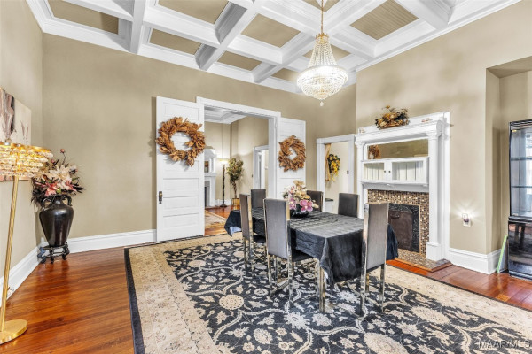 Spanning 3,868 square feet, the home offers four generously sized bedrooms and three full baths. The fourth bedroom can be utilized as a bedroom or a welcoming downstairs den. Each bedroom is spacious and ideal for comfortable guest accommodations. The inviting living areas feature fireplaces throughout the main rooms, creating warm, cozy spaces to relax and gather. The dining room truly shines, highlighted by a beautiful chandelier and coffered ceiling, perfect for hosting memorable dinners and special occasions.