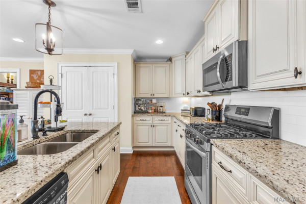 The open-concept kitchen is a standout with granite countertops, stainless steel appliances (including the refrigerator), a large island, and an oversized pantry, all overlooking the dining area and expansive great room complete with a vaulted ceiling and cozy gas fireplace—ideal for both everyday living and entertaining.
