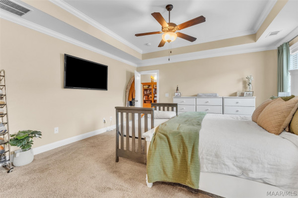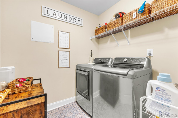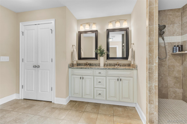 The primary suite is tucked away on its own private hallway and offers a true retreat with double vanities, a soaking tub, a spacious walk-in tile shower, and a large walk-in closet. Just outside the primary suite is the stairway leading to the bonus room and convenient half bath.