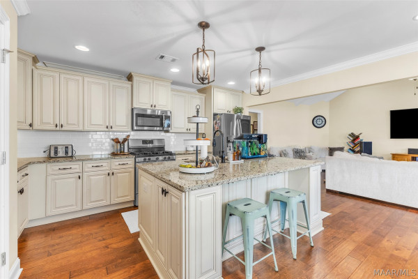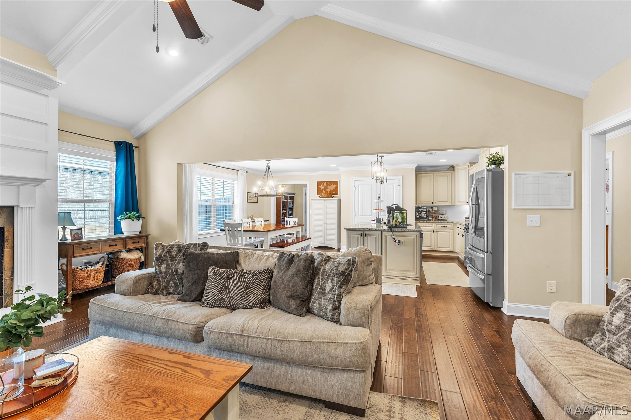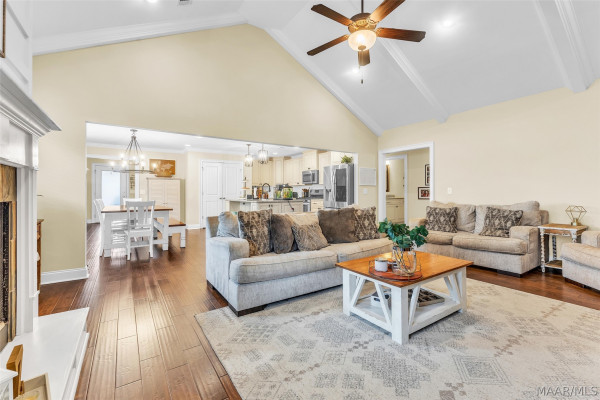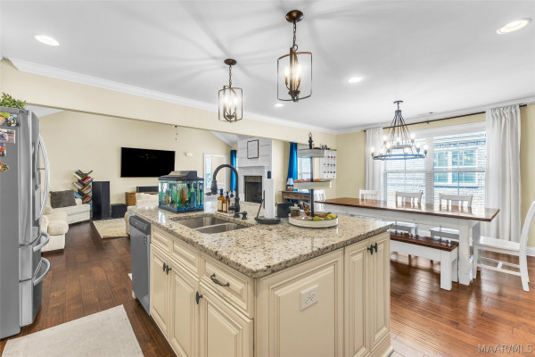 The open-concept kitchen is a standout with granite countertops, stainless steel appliances (including the refrigerator), a large island, and an oversized pantry, all overlooking the dining area and expansive great room complete with a vaulted ceiling and cozy gas fireplace—ideal for both everyday living and entertaining.