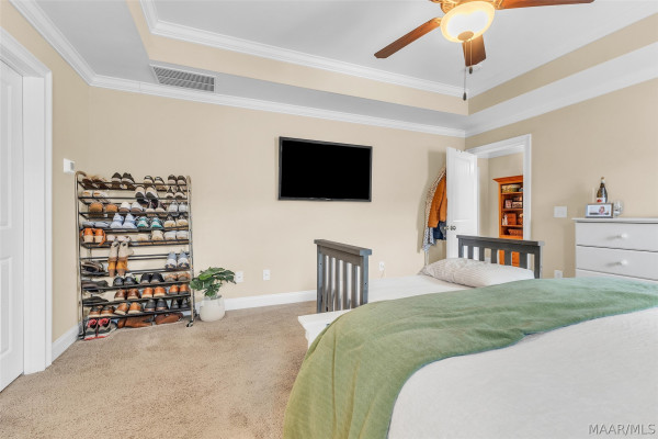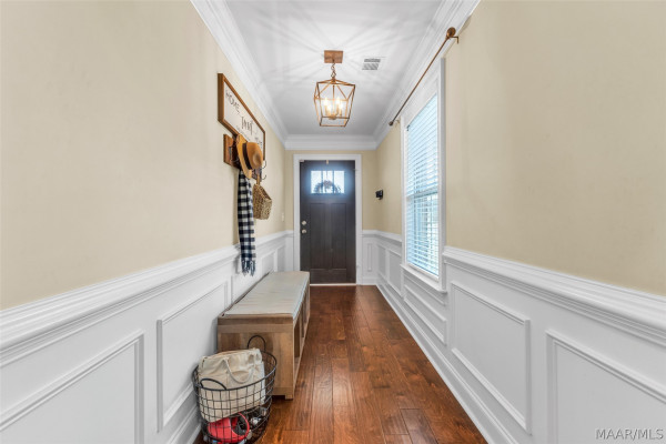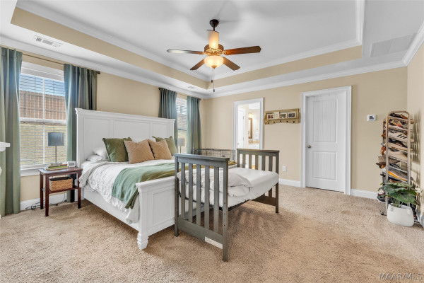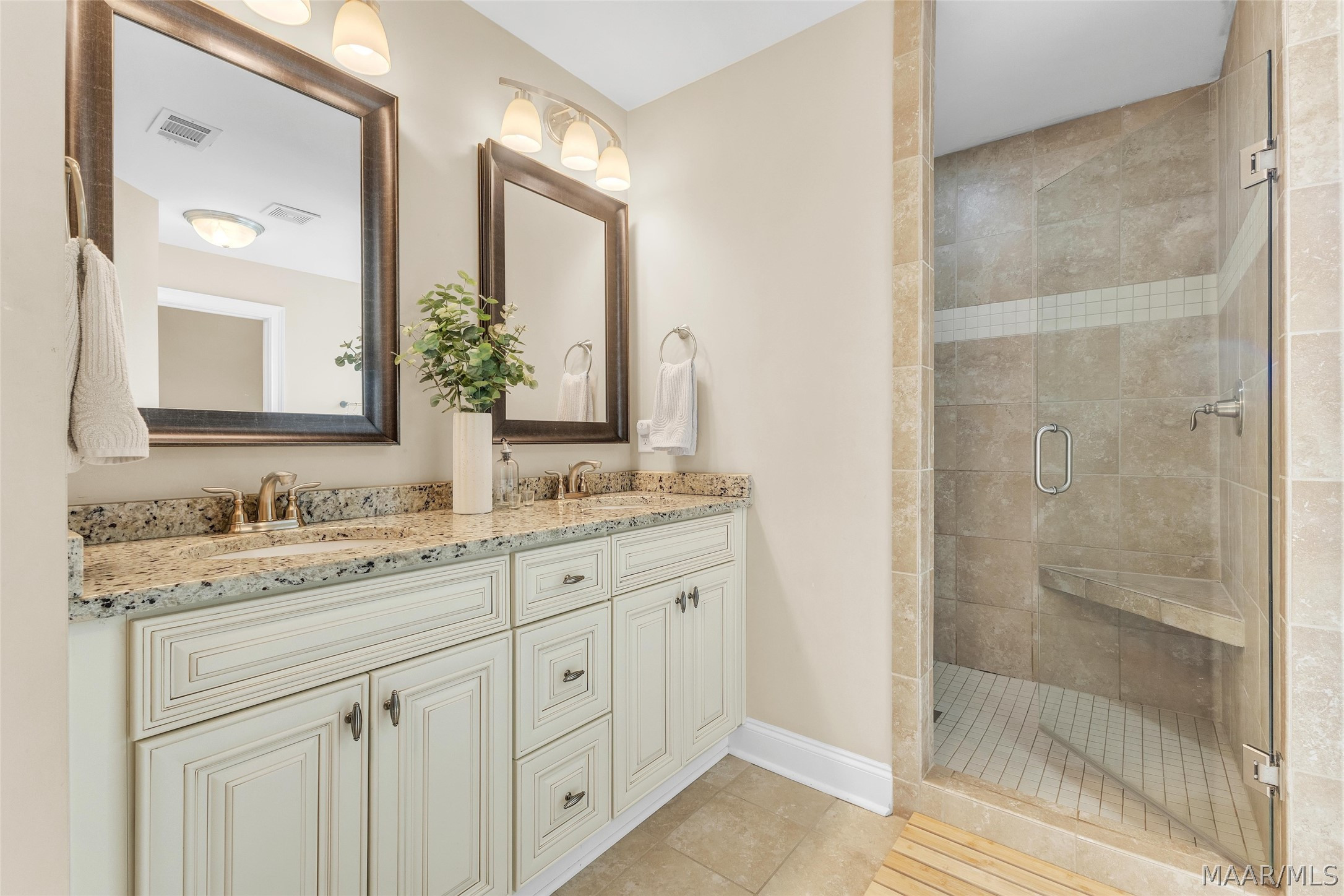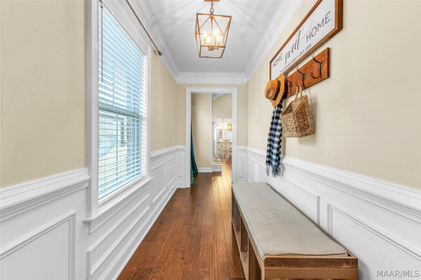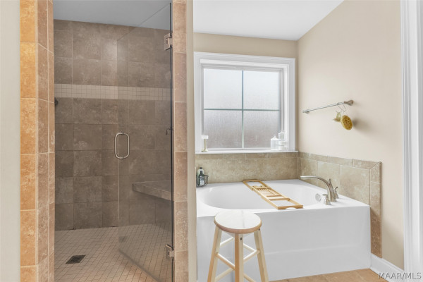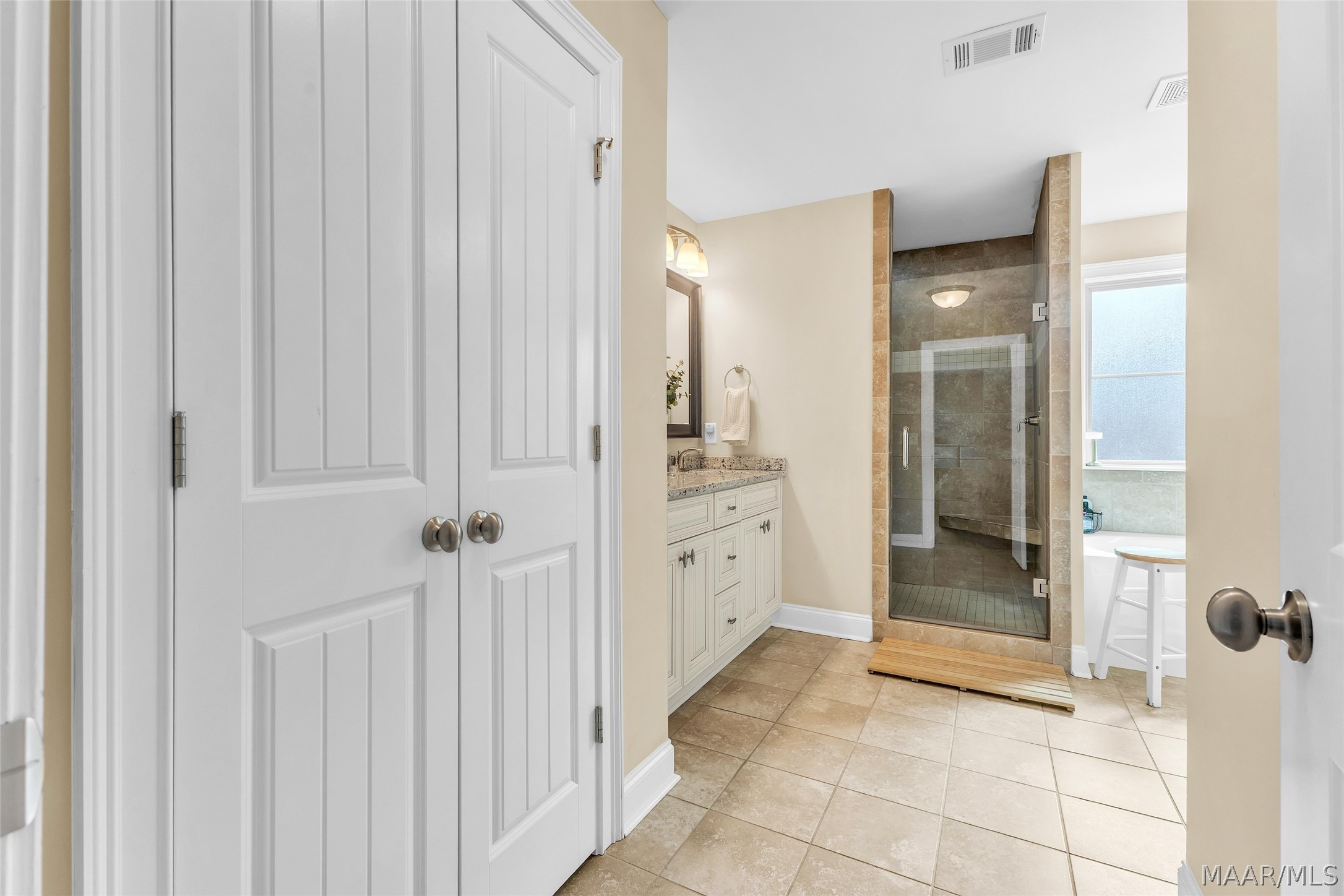 The primary suite is tucked away on its own private hallway and offers a true retreat with double vanities, a soaking tub, a spacious walk-in tile shower, and a large walk-in closet. Just outside the primary suite is the stairway leading to the bonus room and convenient half bath.