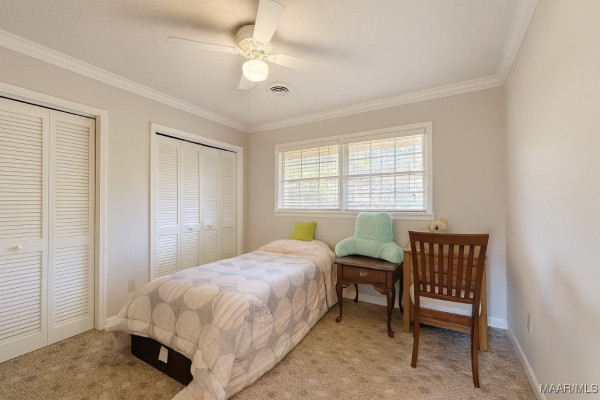 Down the hall you’ll find four bedrooms and a large, updated hall bath ideal for guests. The primary bathroom has been updated with new tile and features a walk-in shower—no tub to step in and out of. The primary bedroom includes French doors that open to the backyard.