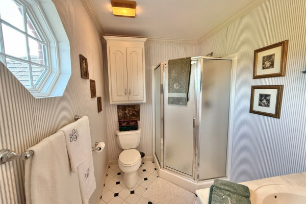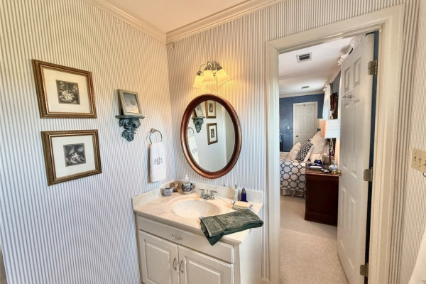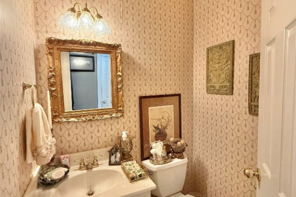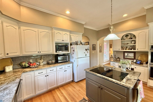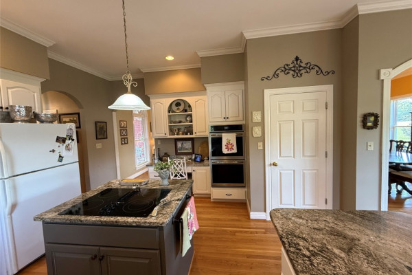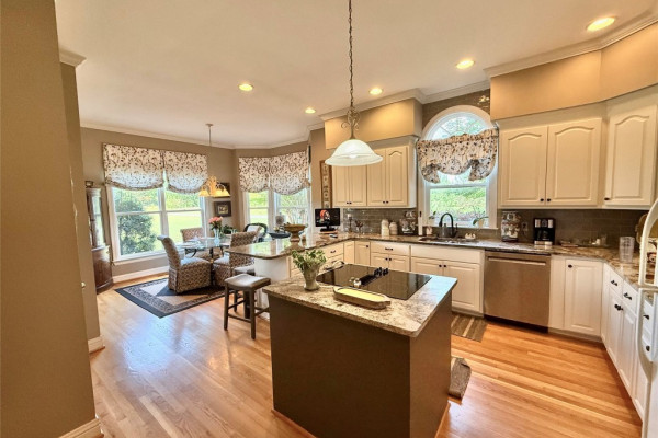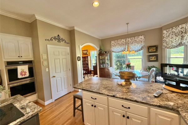 The master suite is conveniently located on the main level, while the updated kitchen boasts a large island, granite countertops, and opens to a charming breakfast room filled with natural light. A half bath is located just off the kitchen for added convenience.