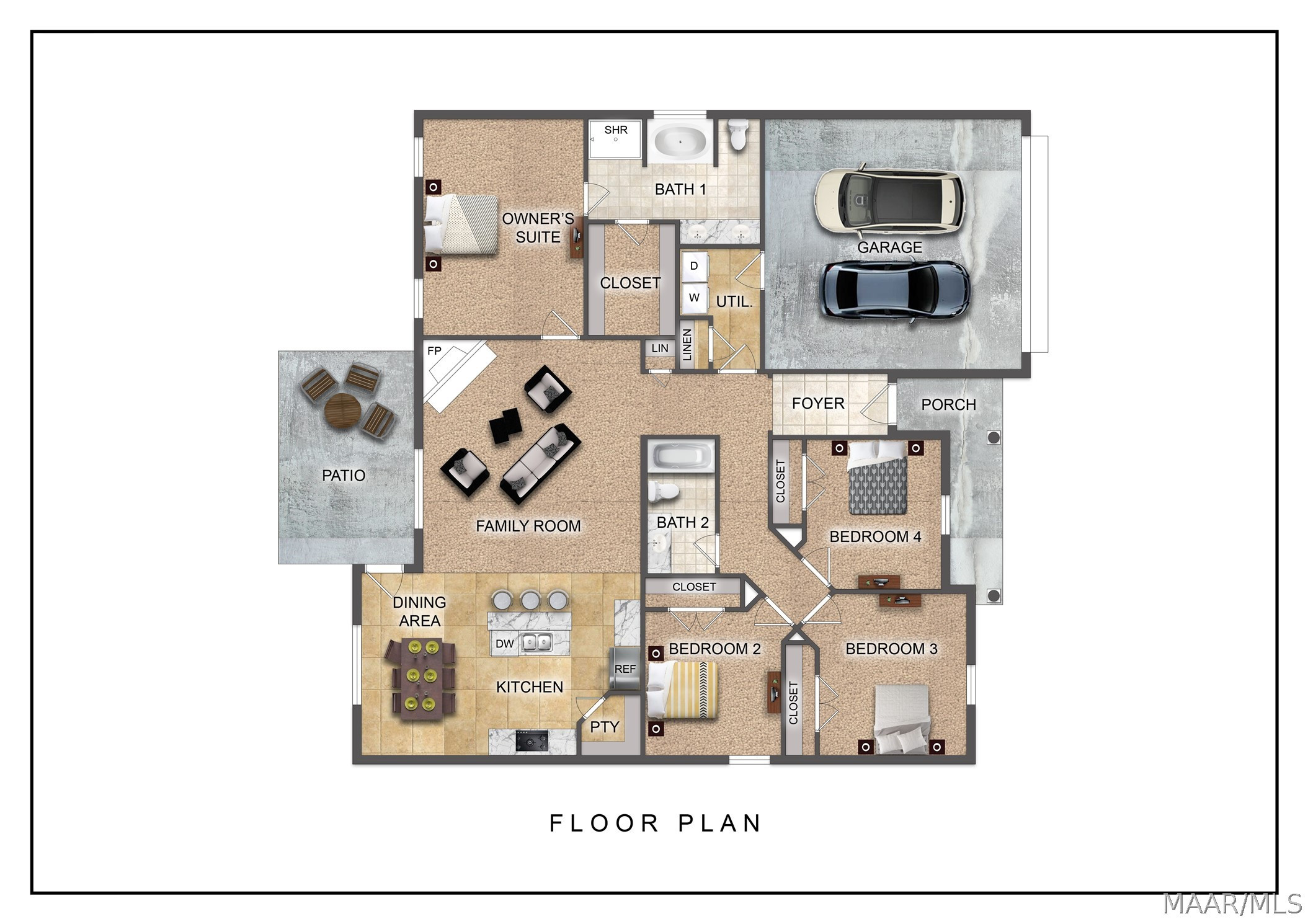 Serenity begins when you enter the Sawgrass floor plan. The Sawgrass was built with four well sized bedrooms and two bathrooms. Every square foot of this well thought out floor plan was made for living comfortably. This floor plan boasts an open concept living area for an update and modern style. The living room is the perfect space to enjoy time curled up in front of the tiled woodburning fireplace. While the connected eat in kitchen is well set up for hosting guests with its great layout and workflow. The energy star appliances this eat in kitchen enjoys are ideal for a budding chef or choose to utilize the ample counterspace on the kitchen island if you’re a takeout fan instead. The best part of having four bedrooms to fit everyone’s needs is knowing that the owner’s suite is tucked away and offers itself as a private haven with a walk-in closet that fits every wardrobe. The owner’s suite bathroom is truly a retreat, designed with dual vanity sinks and a separate garden tub so you can soak the day away. When you do decide to leave the sanctuary of your room, you can spend your time blissfully lounging on the poured concrete patio or front porch knowing that this one-story floor plan is low- maintenance and move-in ready. You’ll also have peace of mind knowing that the Sawgrass is equipped with features that keep your monthly utility bills low, like a heat pump hot water heater, spray foam insulation, and double paned low E vinyl windows. Features include: 10′ Ceiling in Family Room | Wood Burning Fireplace | Large Kitchen Island with Breakfast Bar | Dining Area & Breakfast Nook; Separate Garden Tub & Shower in Master Bath | Double Vanities in Master | Large Walk-in Closets| Raised Vanities | Hard Tile in Fireplace & Bath: Centrally Wired Command Center | Garage Door Openers: Spray Foam Insulation in All Exterior Walls & Roof Line | Energy Saving Heat Pump Hot Water Heater