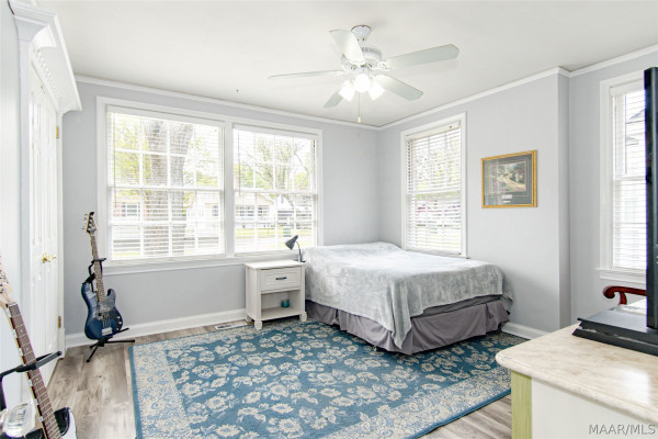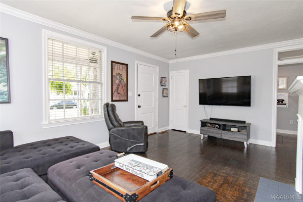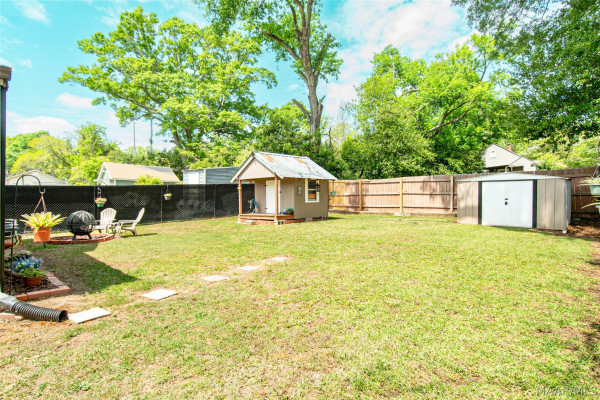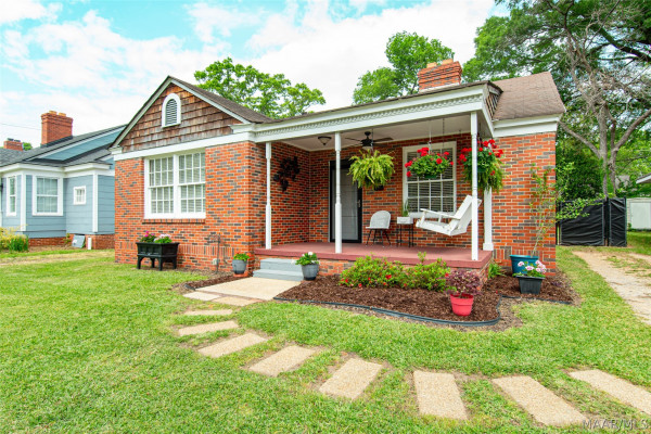 Welcome to this beautifully maintained classic home, where charm meets modern comfort. Featuring rich hardwood floors throughout and elegant colonial-style 4-inch baseboards paired with crown molding, every detail adds warmth and character. Enjoy cozy evenings by the working gas fireplace with new gas logs, or relax on the spacious front porch complete with a charming swing—perfect for morning coffee or evening unwinding. Inside, natural light pours through an impressive 19 windows, all recently painted and glazed, creating a bright and inviting atmosphere throughout the home. The updated HVAC system (2023) with a Google Nest thermostat ensures year-round comfort. Ceiling fans are installed in all three bedrooms, the living room, and even the front porch for added efficiency and comfort. The home offers exceptional functionality with built-in bookshelves and cabinetry, plus a versatile back bedroom featuring a walk-in closet, private half bath, and its own separate entrance opening onto the screened-in patio—ideal for guests or a home office. An additional kitchen entrance adds convenience and flow. The main bathroom is designed for relaxation, offering both a separate shower stall and a tub/shower combo. The dining room opens beautifully through French doors, enhancing both natural light and indoor-outdoor connectivity. Two-inch wood blinds are installed throughout for a polished finish. Step outside to enjoy a fully fenced backyard with a 6-foot black chain-link privacy fence, a firepit for gatherings, and two storage sheds for all your needs. All appliances including washer and dryer are included. With a storm door at the front entrance, and a layout that blends comfort, charm, and versatility, this home is truly move-in ready and perfect for modern living.