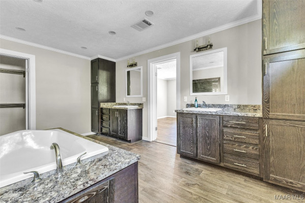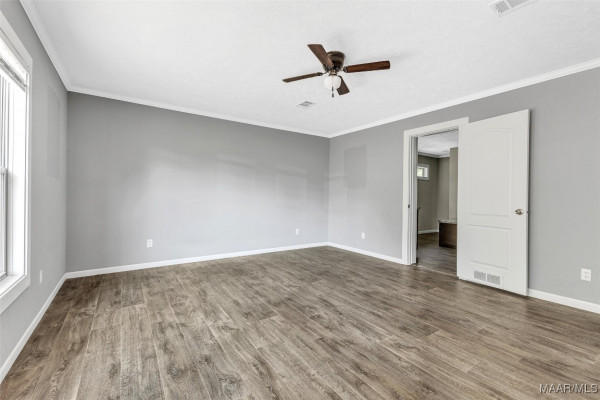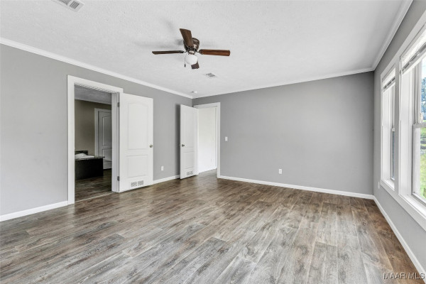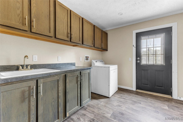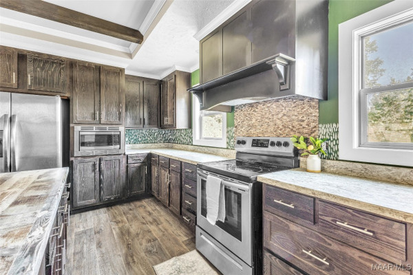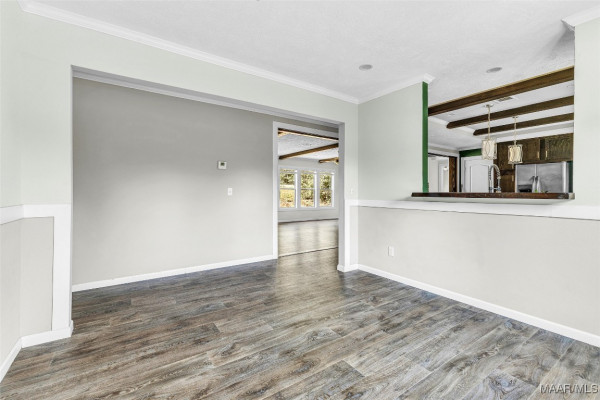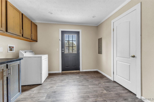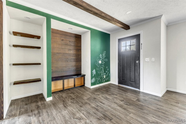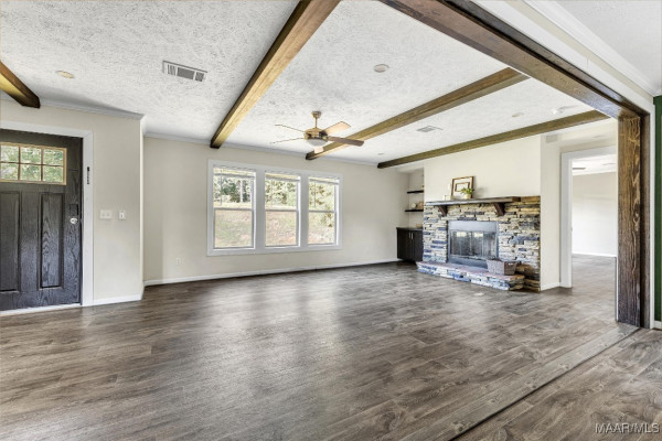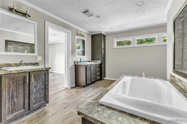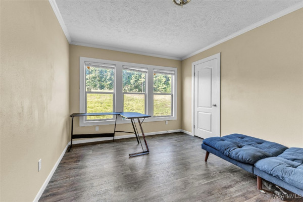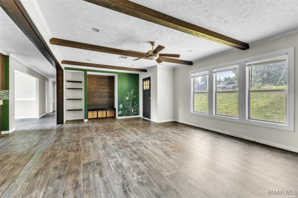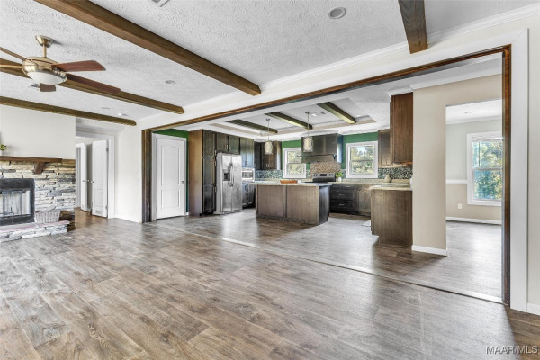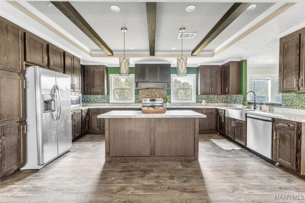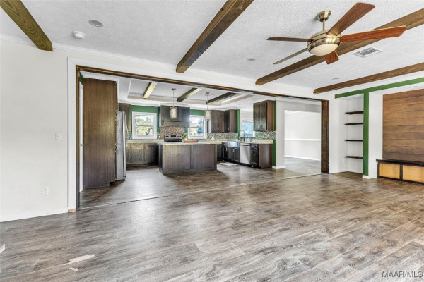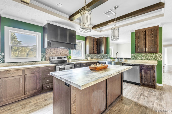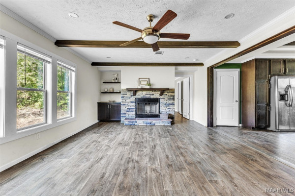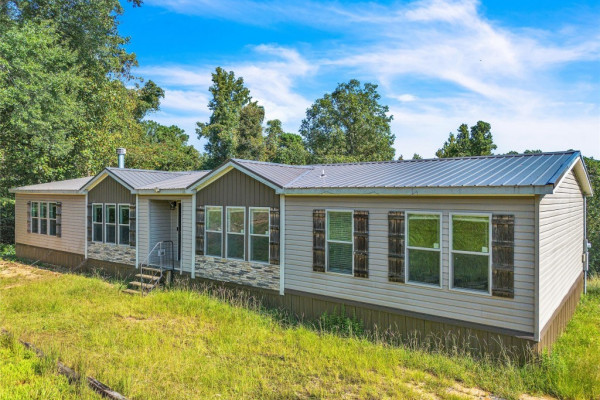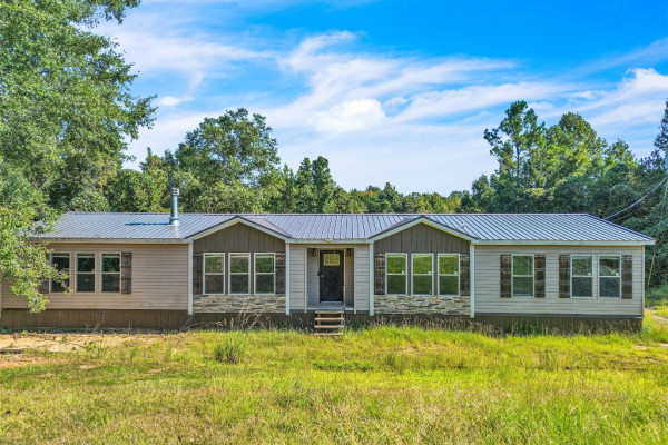 Welcome to quiet, peaceful country living. This beautiful modular home sits on 3 serene, wooded acres just outside of Maplesville. Step inside to a spacious open-concept living room, perfect for entertaining. Stunning LVP flooring, overhead beams, and wood accents bring rustic charm throughout. The living area also includes a built-in hall tree, built-in shelving, and a large brick fireplace with additional storage and display space. Just off the living room, you’ll find a dream kitchen with a large center island, deep stainless-steel sink, and breakfast bar nook overlooking the dining area. There’s plenty of counter space and storage to meet all your cooking and hosting needs. The split floor plan offers privacy with the primary suite located just off the living area. The spacious bedroom leads to a luxurious en-suite bathroom featuring a double vanity with ample cabinet space, huge standalone garden tub for relaxation, an enormous walk-in shower, private toilet nook, and a king-sized closet with built-in shelving. Down the hall, you’ll find three additional bedrooms, each with large closets, and a second full bathroom with a separate sink nook for convenience. A spacious laundry room could easily double as a mud room. With a utility sink and additional cabinet storage for your convenience. If you’re searching for privacy, comfort, and relaxation, this home is the perfect fit. Don’t miss the opportunity to make this peaceful retreat your own!