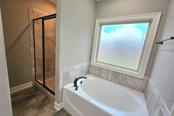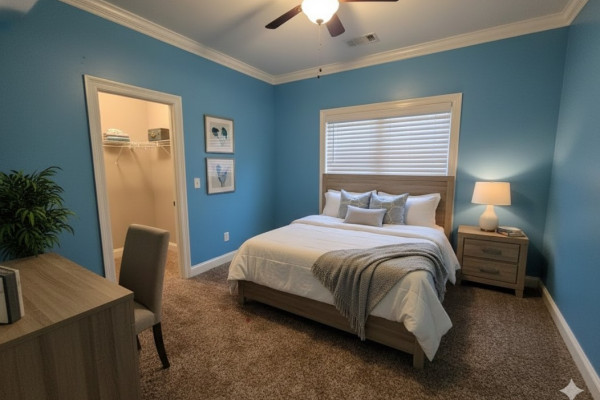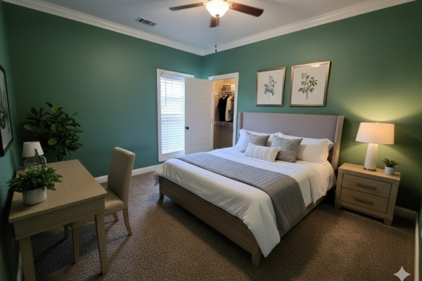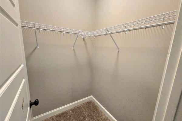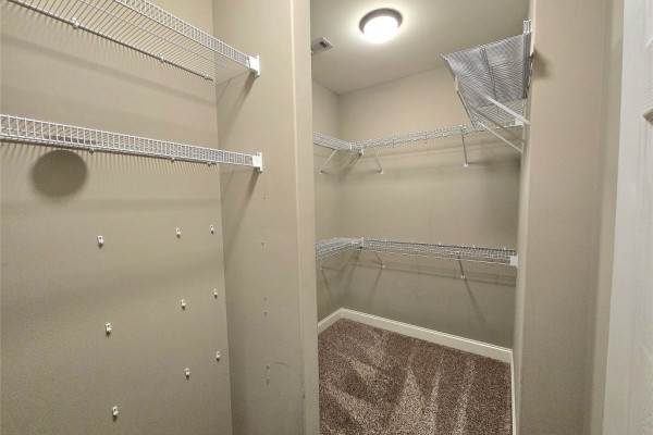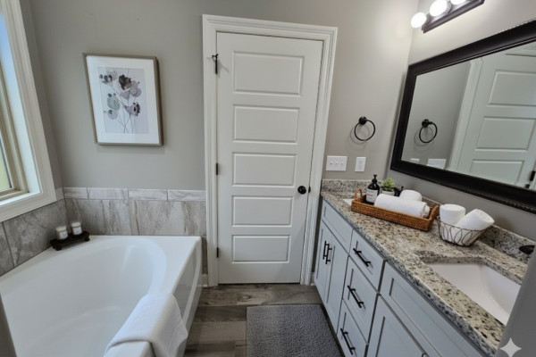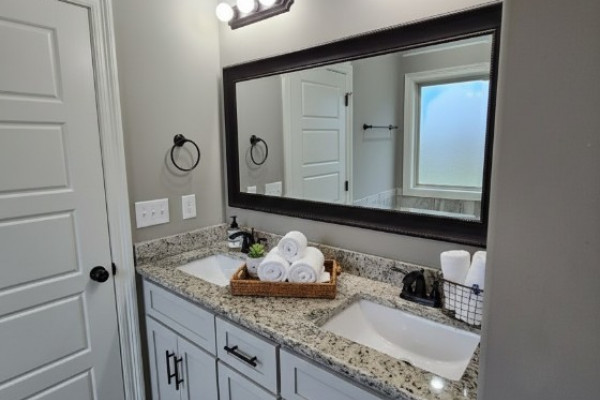 The split floor plan includes two bedrooms at the front of the home and the master suite off the living room. Both the master and one guest bedroom have walk-in closets. Granite countertops continue in both bathrooms, and the home includes double-paned windows throughout for efficiency.