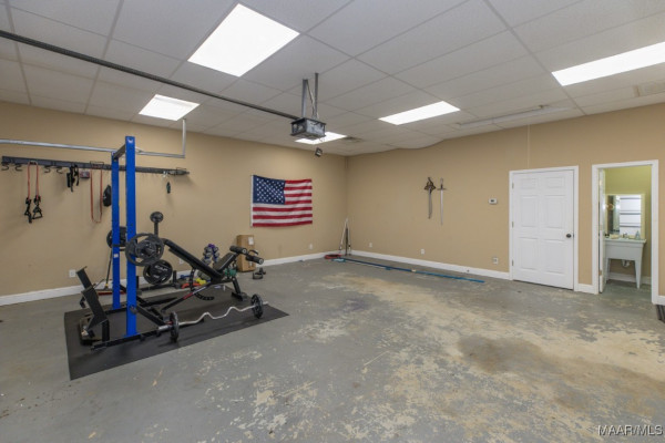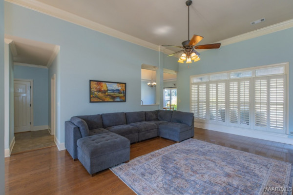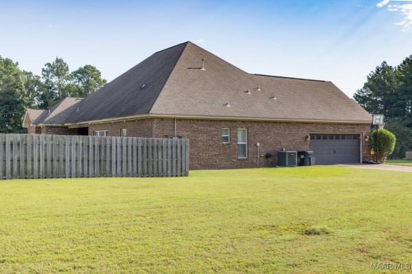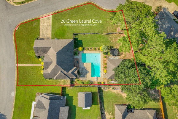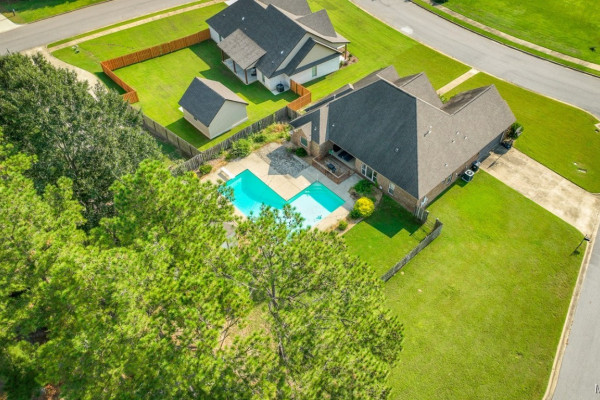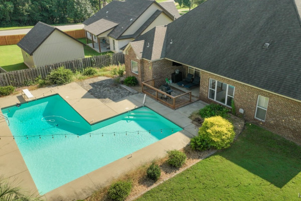 Inside, you’ll find gleaming hardwood floors and plantation shutters throughout, creating a warm and inviting atmosphere. The open-concept kitchen boasts granite countertops, stainless steel appliances, and a formal dining area – ideal for entertaining or family meals. The cozy great room, with a gas log fireplace and built-in bookshelves, features soaring 9-foot ceilings and abundant natural light. The **split floor plan** offers privacy and convenience. The **primary suite** includes two spacious closets and an updated en suite with a walk-in, tiled shower. Adjacent to the great room, a large **guest bedroom** is perfect for visitors or a home office. On the opposite side of the home, the **private guest quarters** feature two bedrooms connected by a stylish **Jack and Jill bath**, offering seclusion and comfort. The **full laundry room** with ample storage, a mud sink, and a convenient **half bath** add to the home’s practical appeal. Step outside to your own **private backyard oasis**, complete with a saltwater pool, installed in 2019, and a beautifully landscaped yard with an irrigation system. A **25′ x 30′ garage/workshop** with spray foam insulation, its own HVAC, and a half bathroom with a mudsink provide ample space for projects or storage.