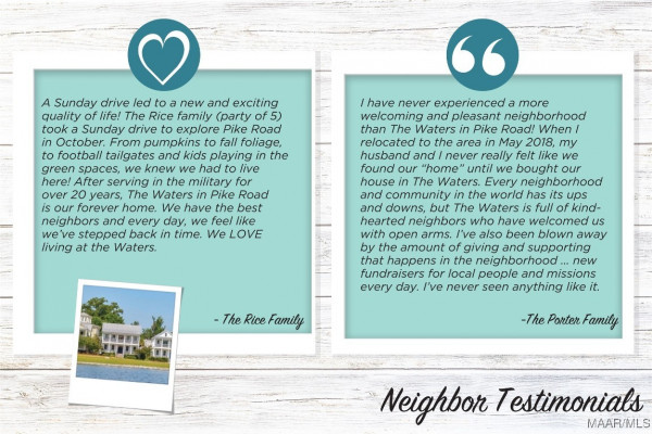 Come Make a Life of It at The Waters in Pike Road, AL! Enjoy resort-style living with world-class fishing, multiple lakes, swimming pools, tennis and pickleball courts, a lakeside beach, dog park, town square, fire pit, soccer field, Playborhood Hill, bocce ball, green space, pavilions, a sport court, gaga pit, kayaking, canoeing, playgrounds, parks, and the Trail to Education leading to the Pike Road Elementary school. Shop and dine at our Town Center businesses or take a short drive to Pike Road Shopping, Eastchase, and Chantilly. Just 2.5 miles off I-85, Exit 16, and zoned for Pike Road Schools (K4-12th grade). Make your dream vacation your everyday life! Seller reserves the right to approve buyer’s mortgage lender.