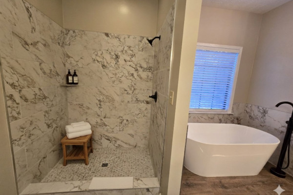 The main master suite includes two walk-in closets, private access to the covered back porch, and a spa-like bathroom with a freestanding soaking tub, large walk-in shower, and separate vanities.