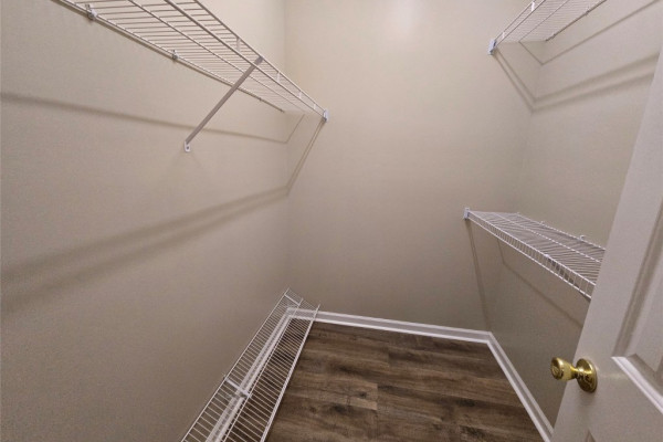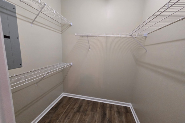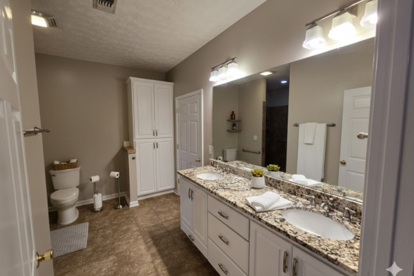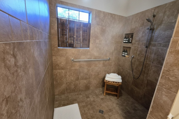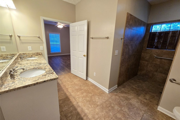 The second suite also offers a walk-in closet and a fully handicap-accessible bathroom featuring a large roll-in tiled shower, double vanities, and abundant cabinet storage.