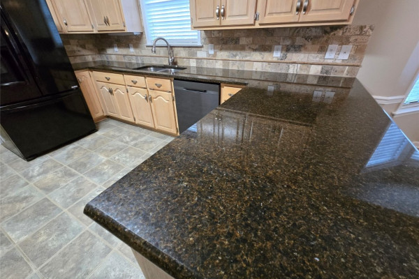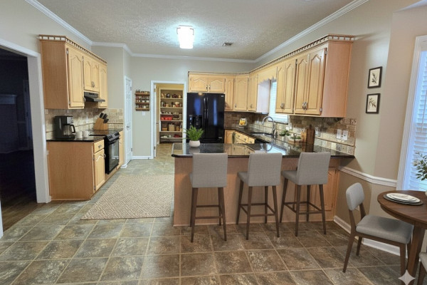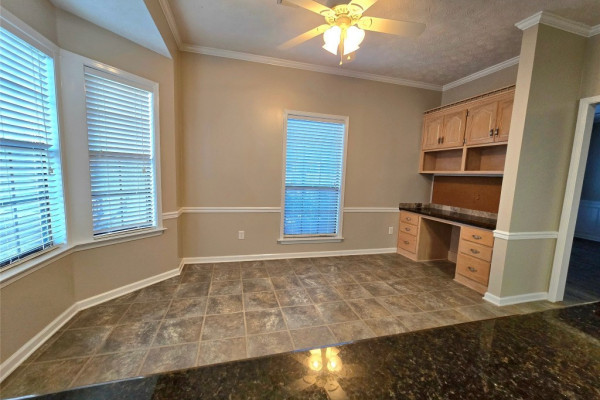 The kitchen and guest bathrooms feature granite countertops, while the primary bathroom is finished with cultured marble countertops. A formal dining room with a chair rail and shadow box half wall adds classic character and charm.