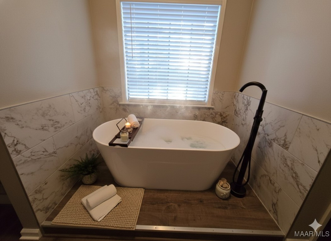 The main master suite includes two walk-in closets, private access to the covered back porch, and a spa-like bathroom with a freestanding soaking tub, large walk-in shower, and separate vanities.