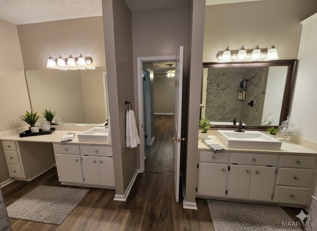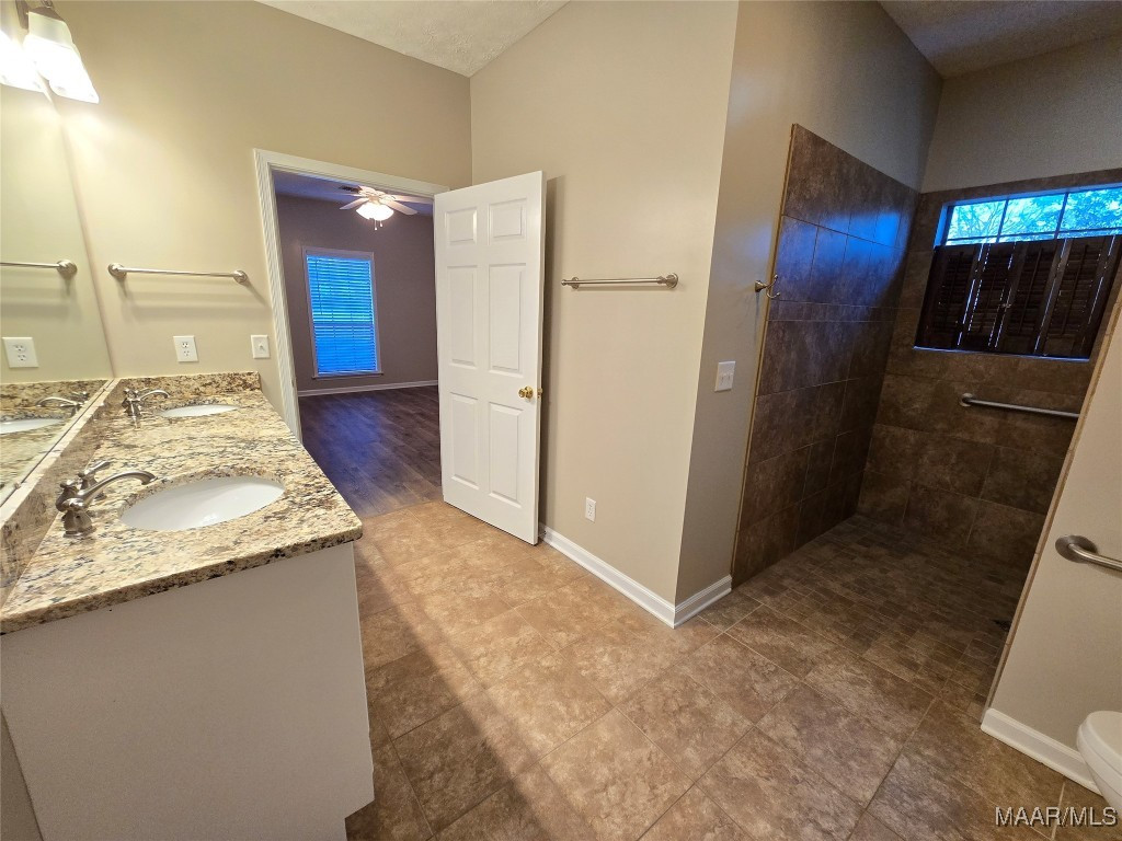 The second suite also offers a walk-in closet and a fully handicap-accessible bathroom featuring a large roll-in tiled shower, double vanities, and abundant cabinet storage.