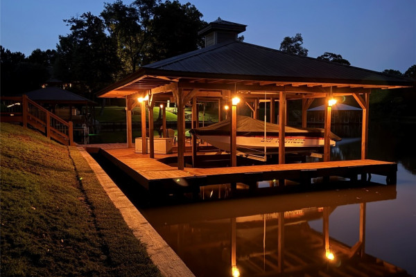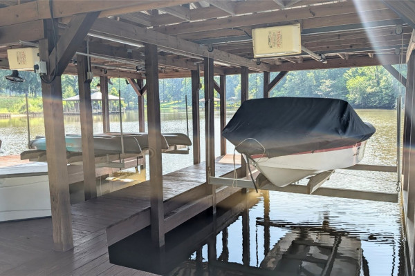 Beautifully landscaped, this gated neighborhood property is set on a premium lot with over 300 ft of water frontage—more than three times the typical riverfront parcel—and is not located on the main river, providing sloping banks and calmer water. The two-stall/slip boathouse includes electric lifts, and the shoreline is reinforced with 200 ft of vinyl corrugated treated lumber seawall. A 2 HP river irrigation pump makes landscaping a breeze, and a private neighborhood boat ramp offers convenient water access nearby.