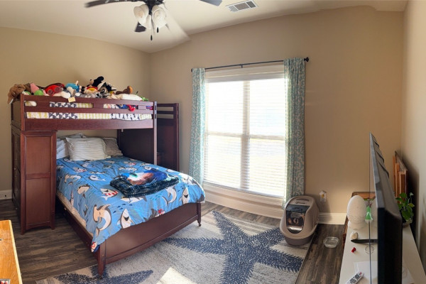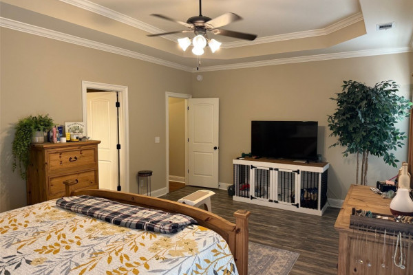Retreat to the large main bedroom, also adorned with elevated boxed ceilings, creating an airy and luxurious feel. The main bath is a spacious sanctuary, complete with double sinks, a separate garden tub, and a magnificent custom-tiled walk-in shower. Bedroom 2 offers the convenience of a walk-in closet, while bedrooms 3 and 4 are well-proportioned with good closet space.
