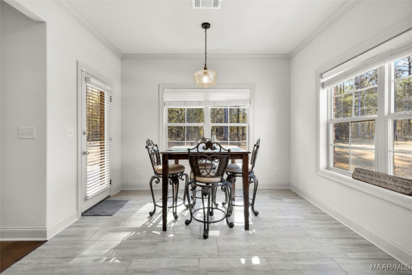 Inside, you’re greeted by a large foyer overlooking the living area, which offers ample space for gatherings & features a cozy fireplace as the focal point. To the right of the foyer is a formal dining room with beautiful wainscoting & a coffered ceiling. Continue through the pantry area with added built-in shelving into the spacious kitchen featuring granite countertops, a cooktop, plenty of cabinet space, a breakfast bar, & a breakfast nook tucked near the entrance to the back porch. Also off the foyer are the laundry room conveniently located near the garage entrance & a half bath for guests.