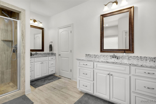 The primary suite is just off the living space & offers room for a king-size bedroom set with space to spare. The primary bath includes oversized double vanities with granite countertops, garden tub, separate shower, & large walk-in closet.