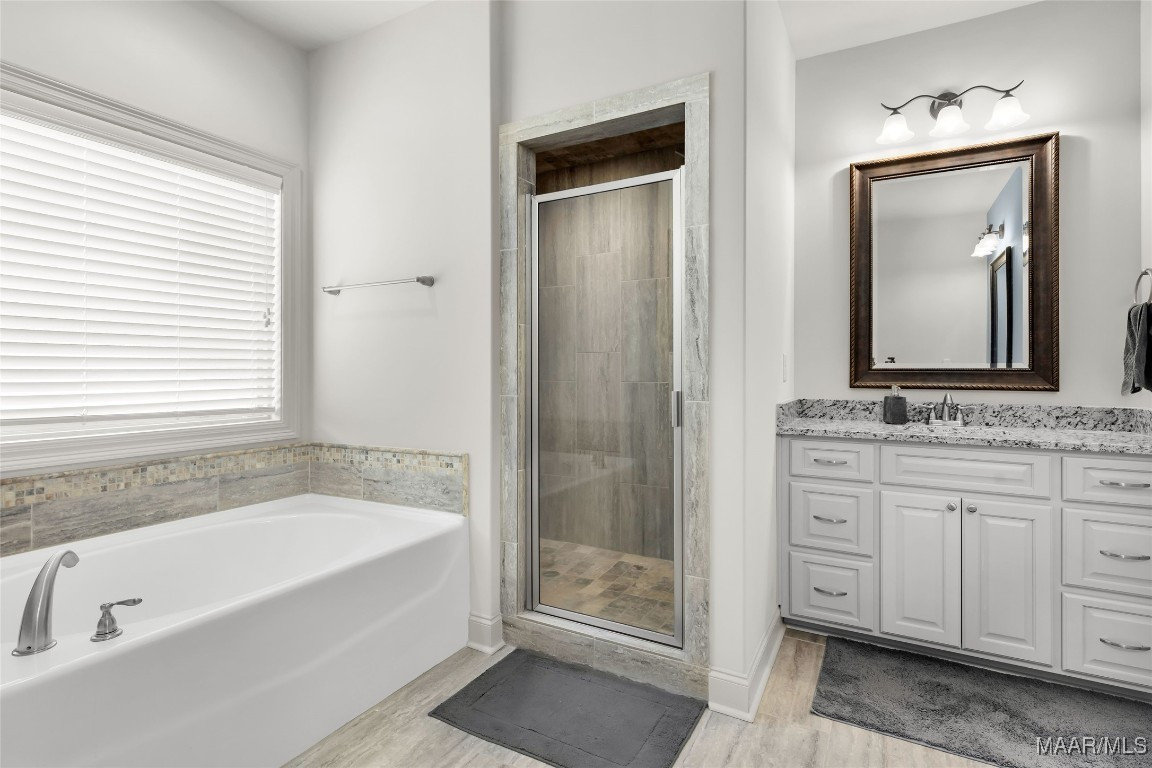 The primary suite is just off the living space & offers room for a king-size bedroom set with space to spare. The primary bath includes oversized double vanities with granite countertops, garden tub, separate shower, & large walk-in closet.
