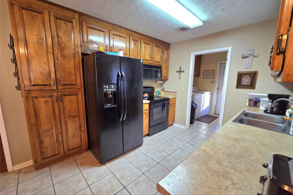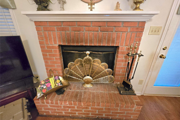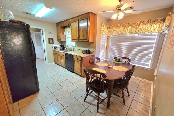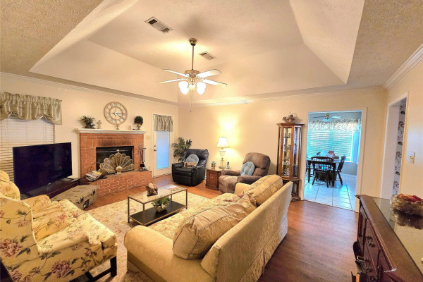 The living room offers a trey ceiling and wood-burning fireplace, creating a warm, inviting space. The kitchen includes a large breakfast nook and flows seamlessly into the living and dining areas, while the laundry room provides abundant cabinetry and countertop space.