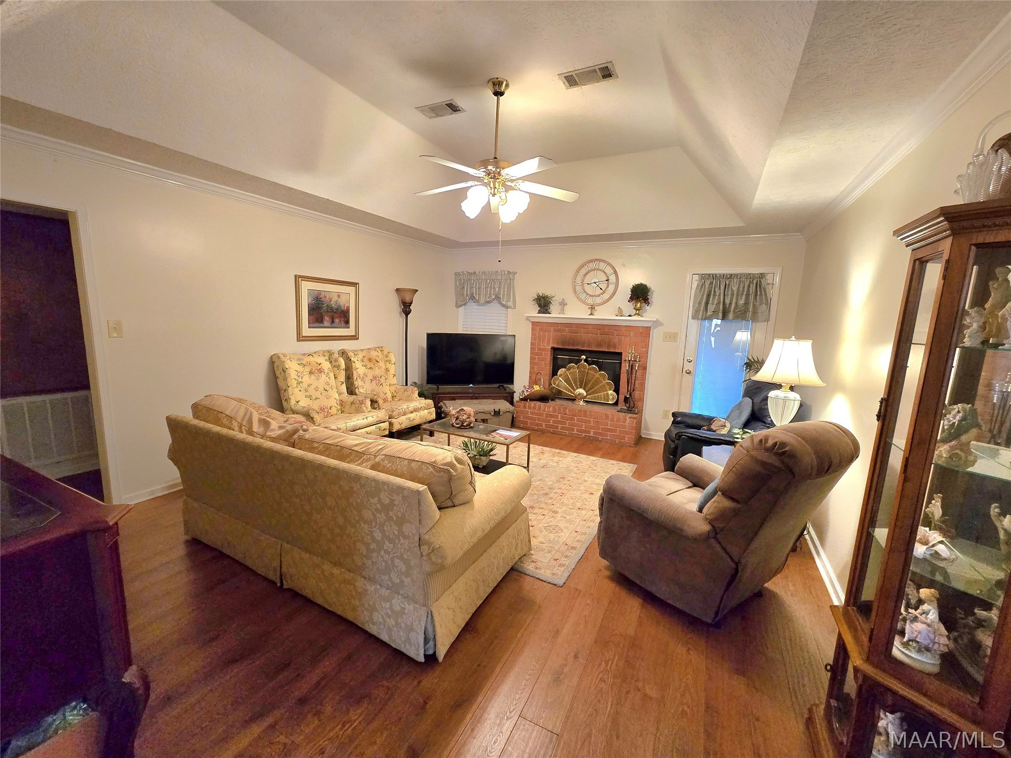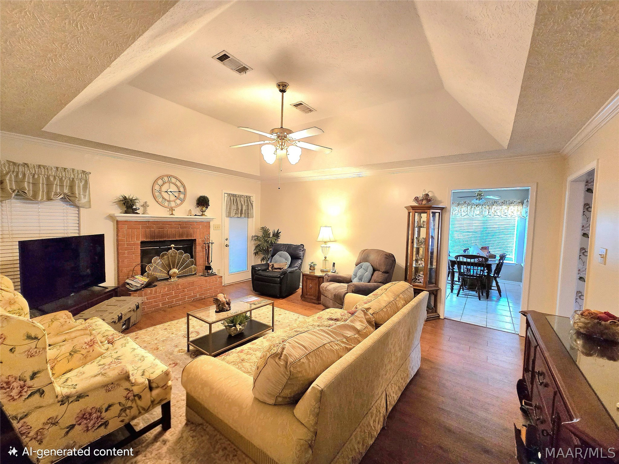 The living room offers a trey ceiling and wood-burning fireplace, creating a warm, inviting space. The kitchen includes a large breakfast nook and flows seamlessly into the living and dining areas, while the laundry room provides abundant cabinetry and countertop space.