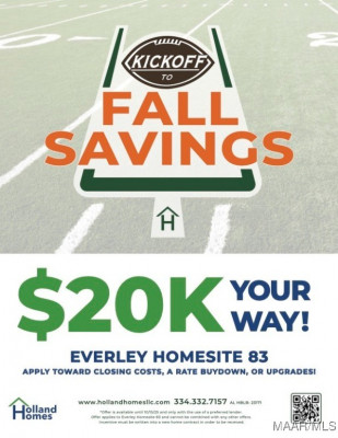Holland Homes LLC – Company core values: PURPOSE; PEOPLE; PROCESS AND PRODUCT/ Building through our innovative Process, we partner with our customers through truth, loyalty, and transparency to provide a customizable experience that exceeds homeowners’ expectations!/All Home features behind the walls integrity building items such as Wind bracing in framing, spray foam insulation in attic/pull down- stairs for easy attic access/ all electric energy efficiency homes/internet smart panel centrally located in laundry room/visit Everly in Pike Road today Model Hours are Tuesday through Saturday noon till office pm or CALL / TEXT Patti Stone 334/651-3003