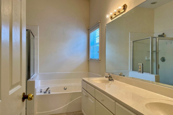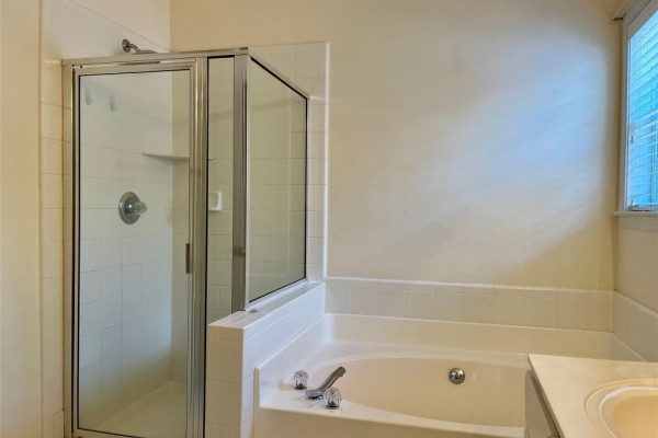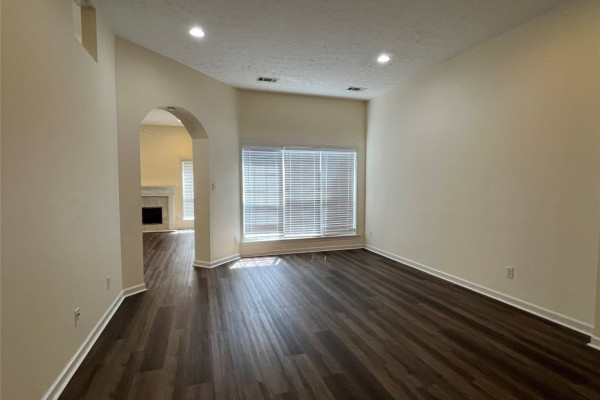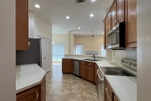 Wonderful 4-bedroom, 2-bath house with 2 living areas in Highland Ridge! It has a great room, family room, dining room, a well laid out kitchen with a dining area and a utility room. Fireplace in Family Room. Large Master Suite w/ Walk-in Closet. Master bath has new tile floor, garden tub, double sinks, & shower. Sunny breakfast area. Kitchen has new dishwasher and refrigerator, plenty of cabinet space & double-door pantry. Features include high ceilings, fireplace, refrigerator, dishwasher, disposal, stove, microwave, ceiling fans, patio and fenced yard. Tenants have access to neighborhood pool with fee.