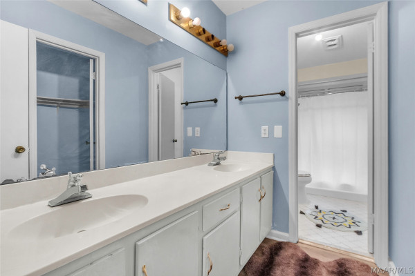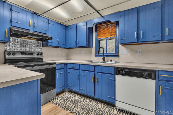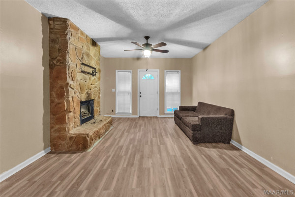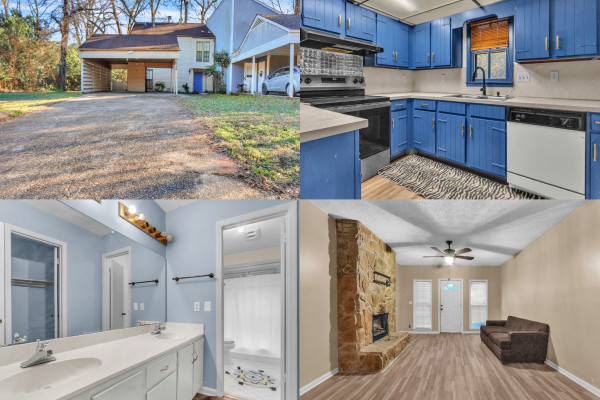 Charming 3-bedroom, 2.5-bath home offering comfort and functionality in a peaceful setting. The exterior features a welcoming façade with a spacious driveway and covered parking. Inside, the home includes a cozy living area highlighted by a striking stone fireplace and durable flooring, perfect for everyday living or entertaining. The kitchen showcases bold blue cabinetry, ample counter space, and modern appliances, providing a functional and inviting cooking space. Bathrooms are well-appointed with double vanities and clean, updated finishes. Natural light flows throughout the home, enhancing the bright and open feel. With generous living spaces, practical layout, and inviting outdoor surroundings, this property is ideal for homeowners seeking comfort, character, and convenience.