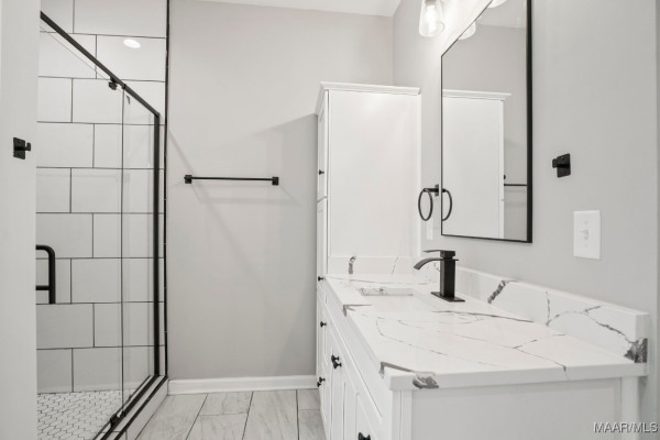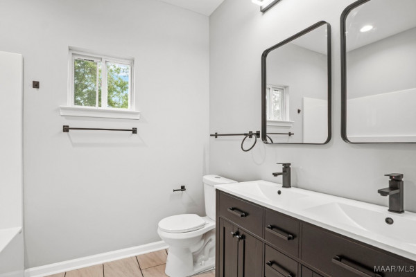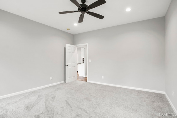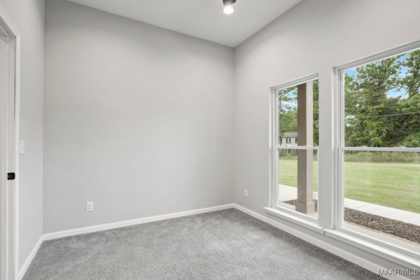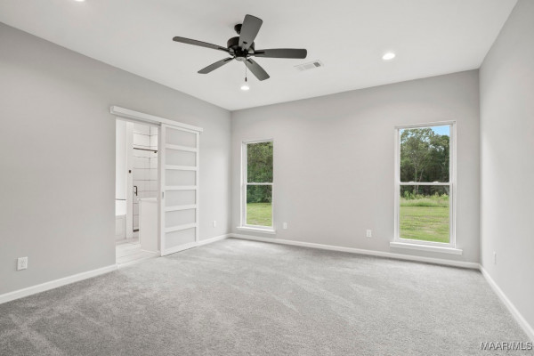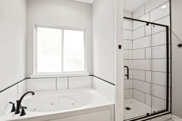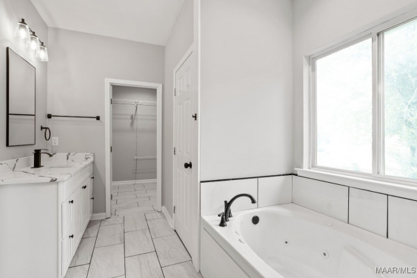The master suite offers a spa-like bathroom with a jetted tub, spa shower with robe hooks, and linen cabinetry. Large windows fill the space with natural light, creating a peaceful retreat.