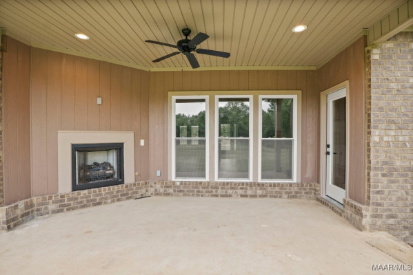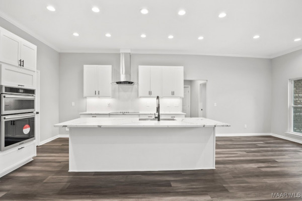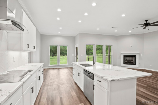 The open-concept living room features a grand, fireplace that serves as the focal point of the space, creating a dramatic yet welcoming atmosphere. It flows seamlessly into the rear patio with a second fireplace, ceiling fan, and TV hookups—ideal for outdoor entertaining. The chef’s kitchen boasts custom granite countertops, electric stove top, an oversized island, stainless steel appliances, built-in wall oven, microwave air fryer combo, farmhouse sink, and voice-controlled hood vent. Under-cabinet lighting and a spacious walk-in pantry adds functionality.