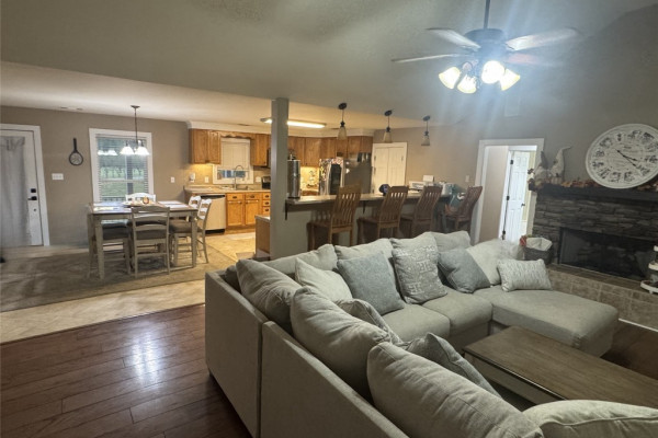 The home offers 3 bedrooms plus an office, an open floor plan, a casual dining area, and a spacious great room that flows right into the kitchen. The kitchen features stainless steel appliances, a gas range, pantry, and a large serving bar. The great room has wood floors, a stone fireplace, and peaceful views of the river.