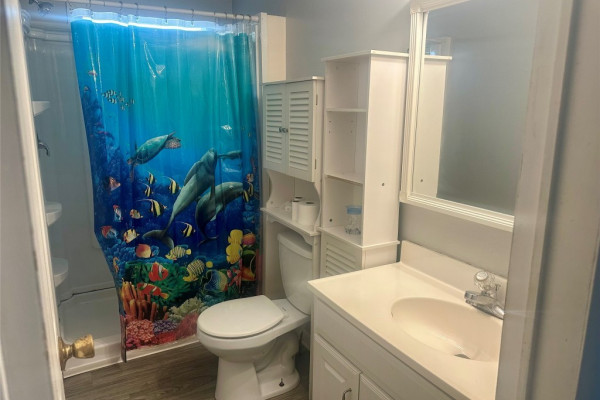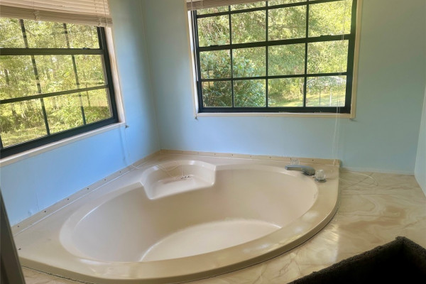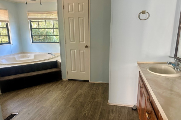 The master bathroom is very spacious with a new refinished garden tub, shower, two closets, double sinks, and storage area. The owners had access panels installed for easy access to the bathrooms plumbing and water heater.