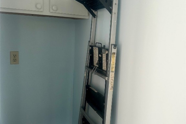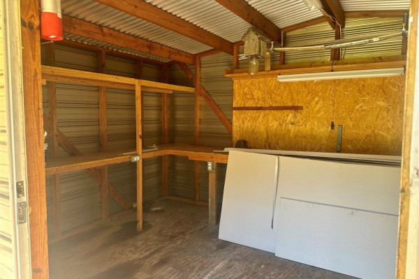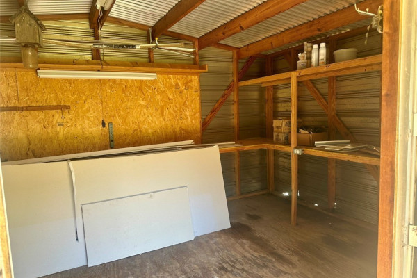 The workshop outside has custom shelving, electric and a front porch. The possibilities are endless for this building!