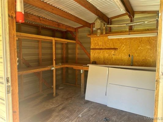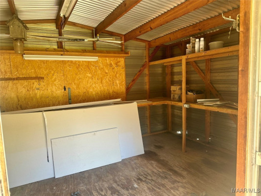 The workshop outside has custom shelving, electric and a front porch. The possibilities are endless for this building!