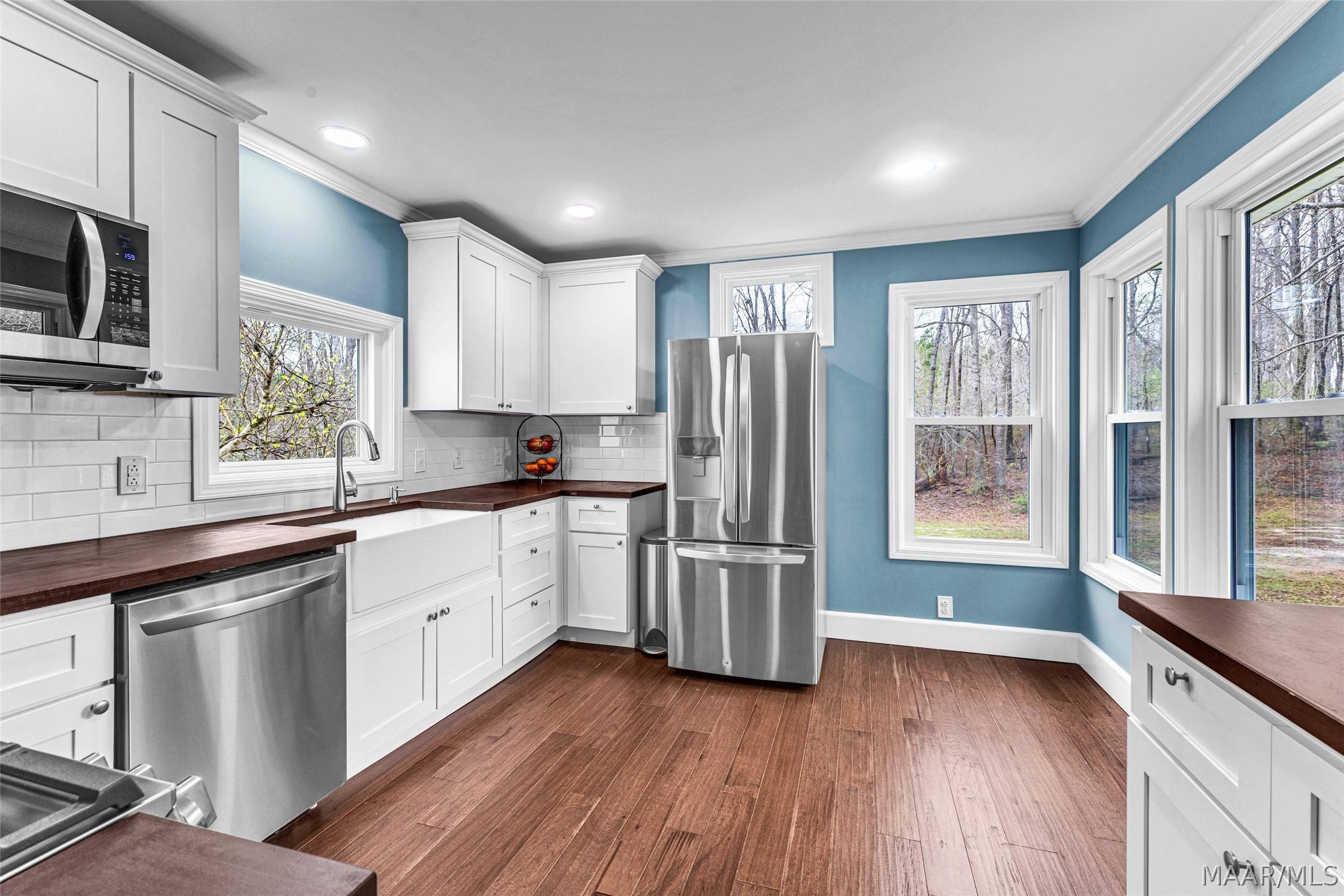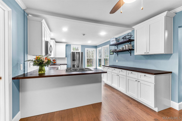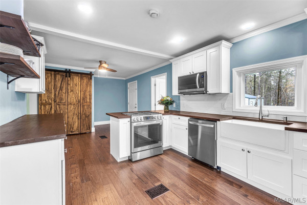 This charming country home offers a peaceful retreat on 4 acres, with 3 acres fully fenced, making it the perfect homestead for horses, cows, and more. Enjoy the best of both worlds with quiet country living just 10 minutes from Lake Martin. As you enter, you’re welcomed into a cozy living room featuring a fireplace. Just off to the left is a flexible space that can serve as a bedroom or office, complete with its own private half bathroom. The home features an open-concept layout, with the living room flowing seamlessly into a dedicated dining area or extended living space. This area connects directly to a newly renovated kitchen, showcasing butcher block countertops, LVP flooring, fresh paint, and all-new appliances. The kitchen also includes a spacious pantry with stylish rolling barn doors and an attached laundry room for added convenience. A back door leads to a brand-new enclosed patio, perfect for relaxing or entertaining. Just off the dining area, the main bedroom offers a spacious retreat with a newly renovated primary bathroom. Large windows overlook the fenced acreage, giving you a perfect view of your animals and land.