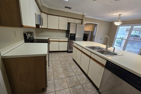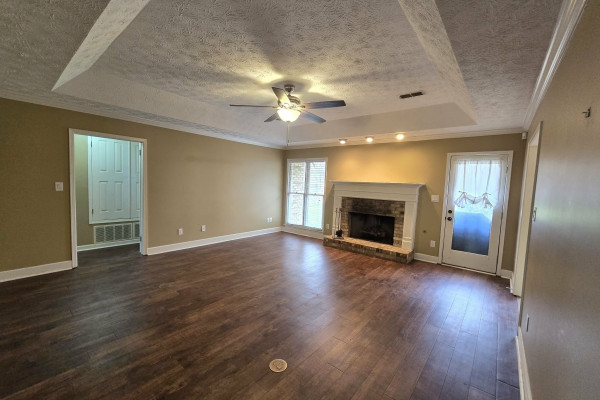 This beautifully maintained, move-in ready home immediately stands out with its inviting exterior and manicured presence in the established Lake Forest community. Step inside to find spacious rooms with a split bedroom plan, tall trey ceilings in both the living room and primary suite, and a warm gas log fireplace that anchors the main living space perfectly.