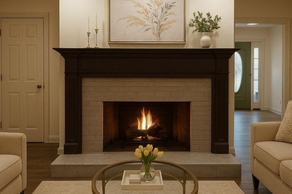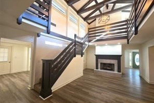 The living room features vaulted ceilings with exposed beams, giving it a warm, open feel. A separate den with a cozy gas fireplace flows into the kitchen and formal dining room—perfect for gatherings.