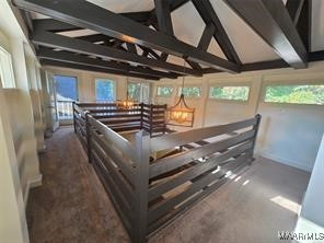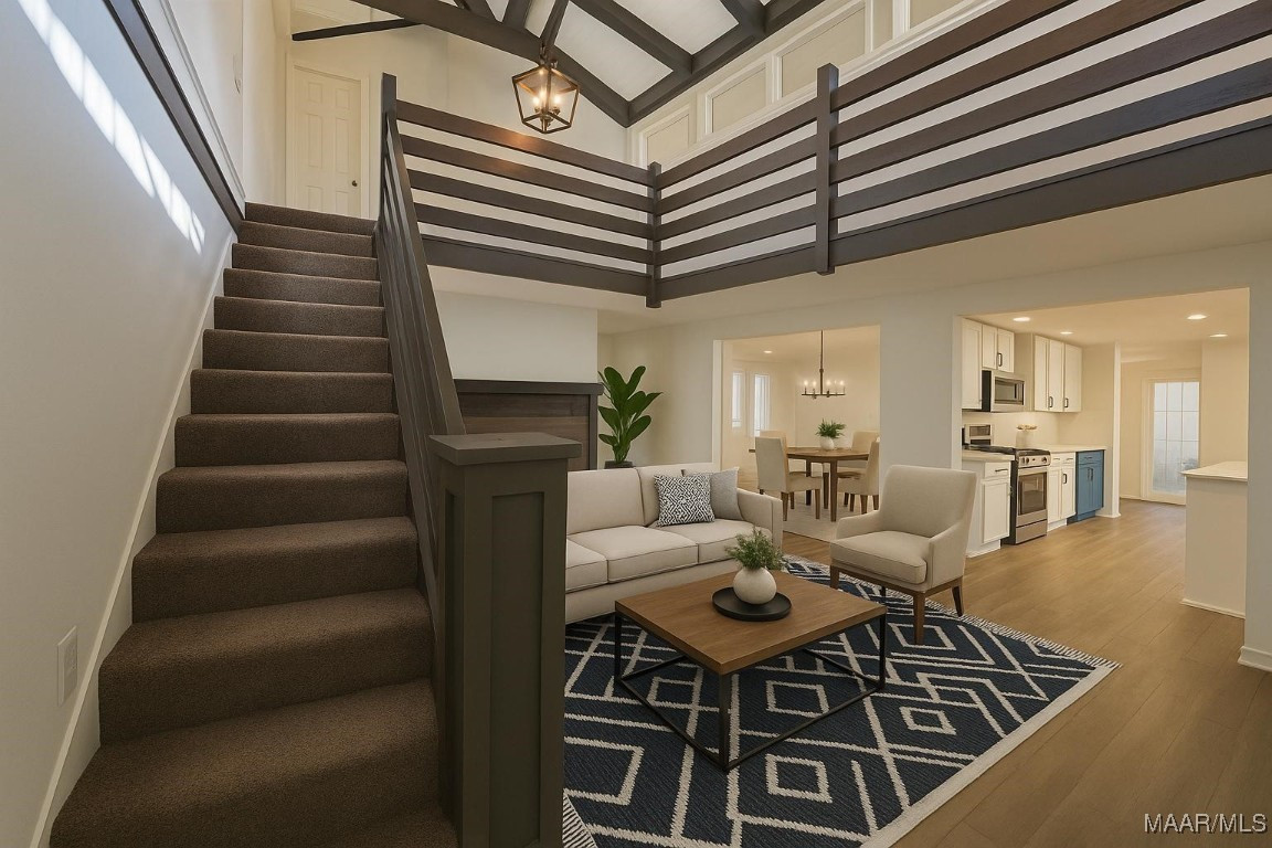 The living room features vaulted ceilings with exposed beams, giving it a warm, open feel. A separate den with a cozy gas fireplace flows into the kitchen and formal dining room—perfect for gatherings.