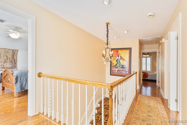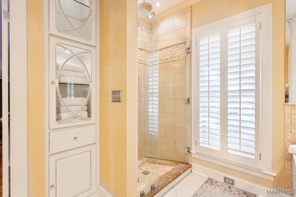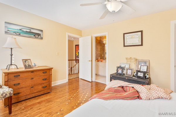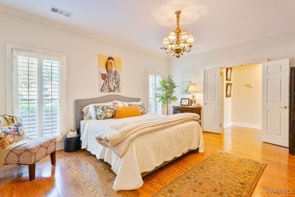 and additional refrigerator. The kitchen and baths have either marble or tile flooring while the remainder of the floors are hardwood. Bespoke 3-inch wood plantation shutters grace every window of the home and detailed trim work is seen throughout. Two fireplaces – both gas fired, enhance the cozy and welcoming atmosphere, allowing both warmth and charm to fill the rooms. Boasting four bedrooms all with walk-in closets, the main-floor Primary enjoys two separate walk-in closets, and an exceptional ensuite. Upstairs, you will find a charming bedroom with a