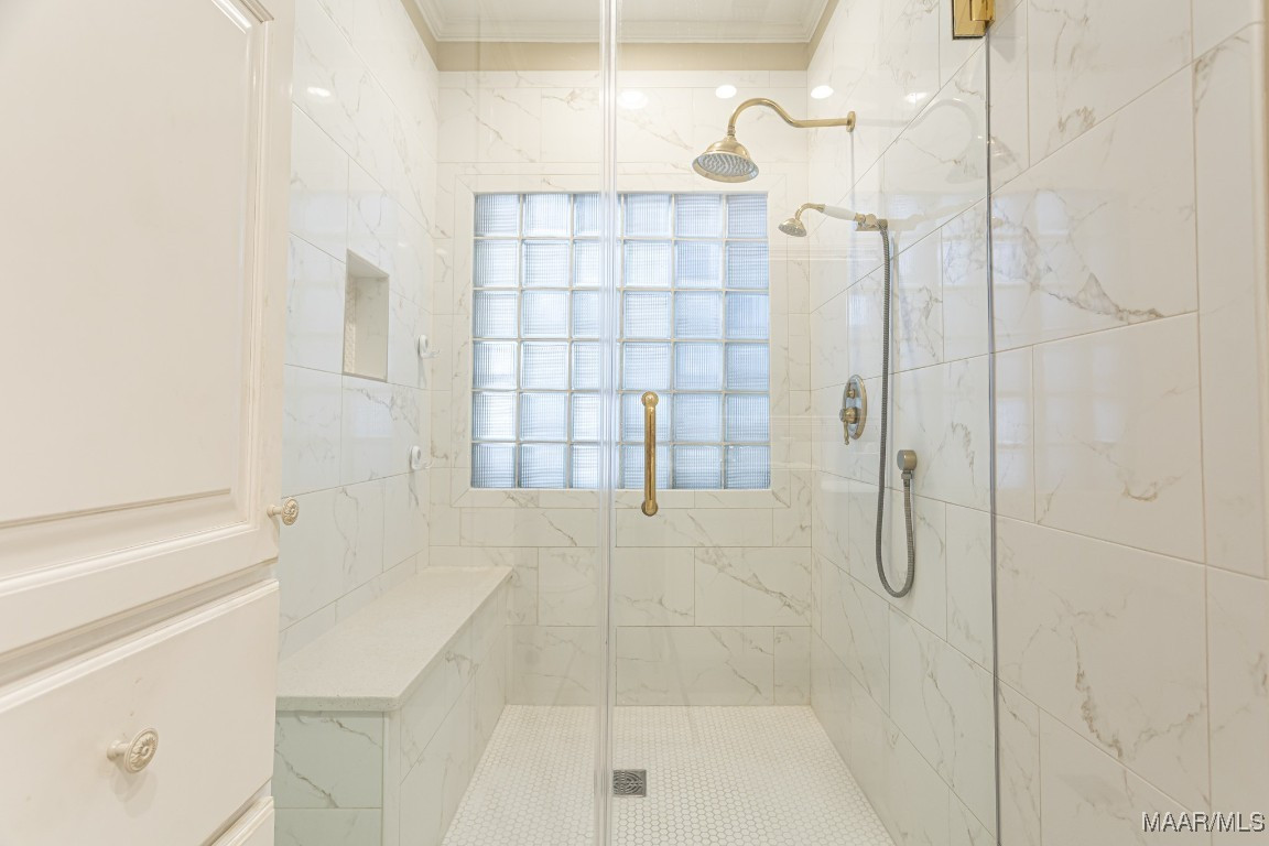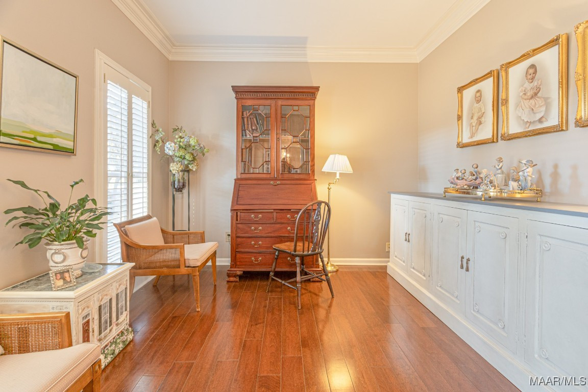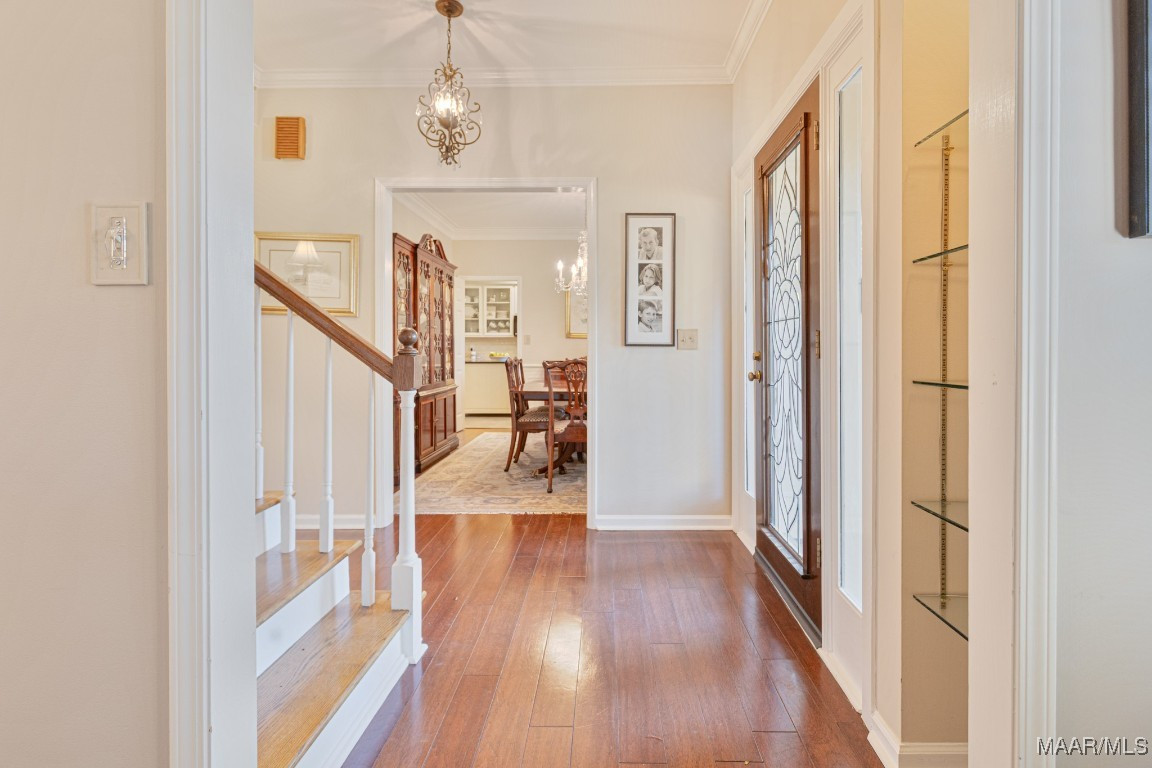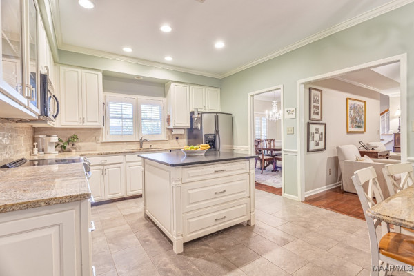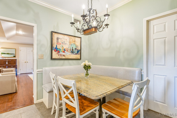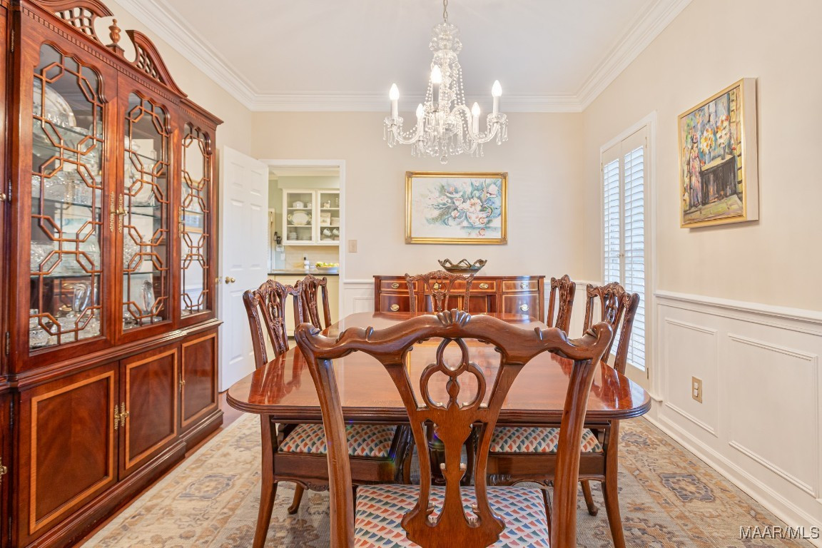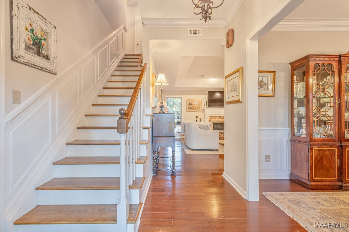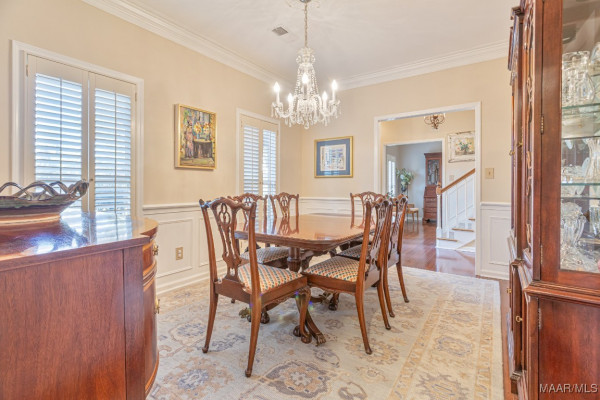 This extremely well-appointed home features a welcoming living room and a beautiful dining room, highlighted by elegant wainscoting that gracefully ascends the staircase. The high ceilings downstairs are complemented by crown molding, adding a touch of sophistication to the home’s interior.