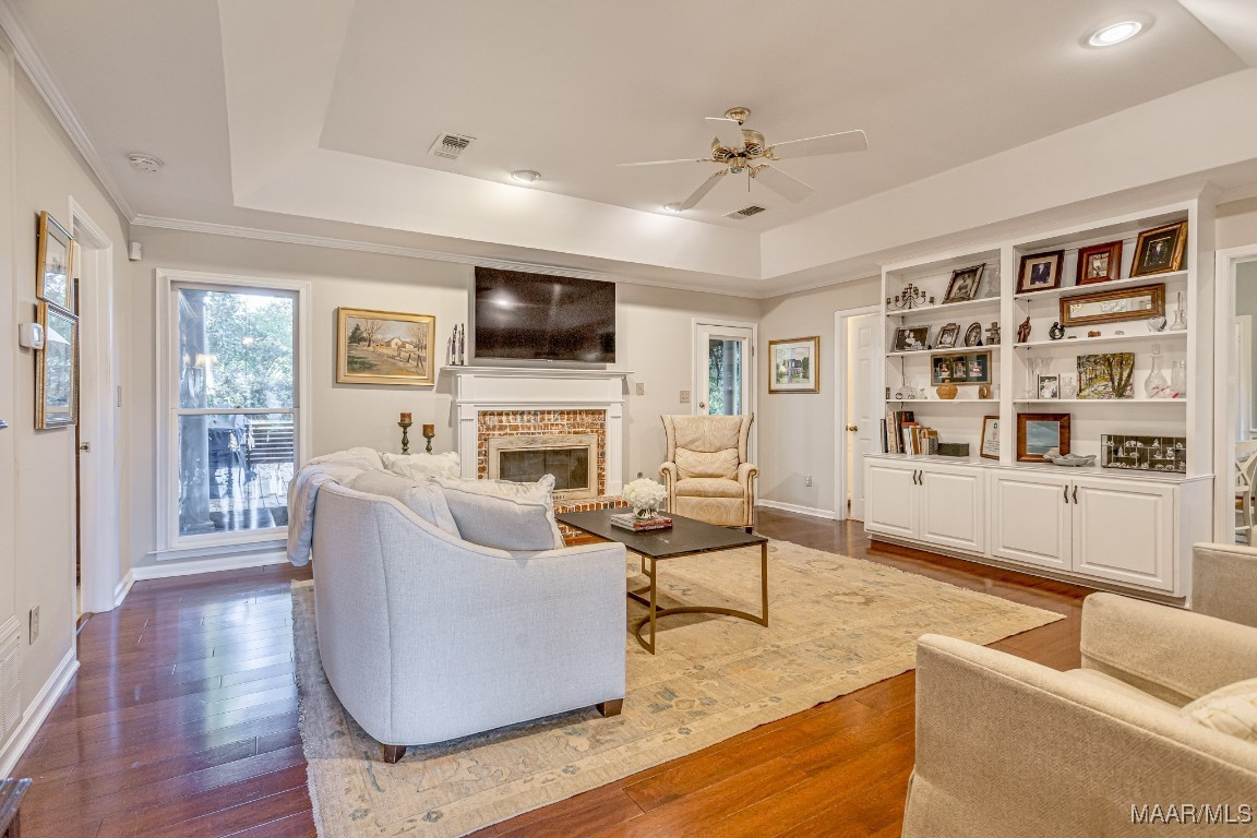 The spacious den boasts a wood-burning fireplace with a gas starter, perfect for cozy evenings. A wet bar and trayed ceiling further enhance this area, making it ideal for both relaxation and entertaining guests.
